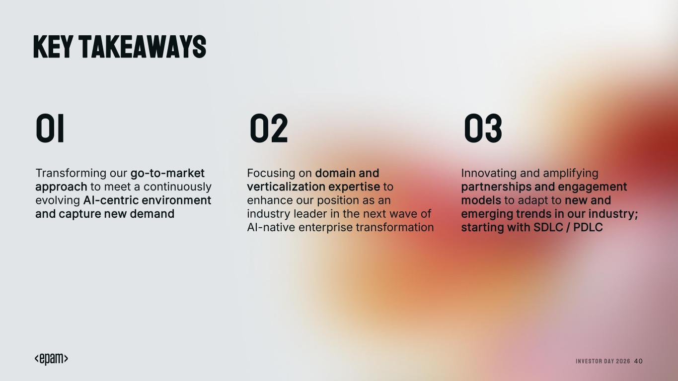 Transforming our go-to-market approach to meet a continuously evolving AI-centric environment and capture new demand Focusing on domain and verticalization expertise to enhance our position as an industry leader in the next wave of AI-native enterprise transformation Innovating and amplifying partnerships and engagement models to adapt to new and emerging trends in our industry; starting with SDLC / PDLC Key takeaways 40 01 02 03