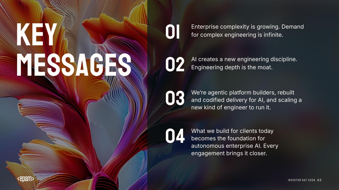 Key messages Enterprise complexity is growing. Demand for complex engineering is infinite. 01 02 AI creates a new engineering discipline. Engineering depth is the moat. 03 We’re agentic platform builders, rebuilt and codified delivery for AI, and scaling a new kind of engineer to run it. 04 What we build for clients today becomes the foundation for autonomous enterprise AI. Every engagement brings it closer. 43