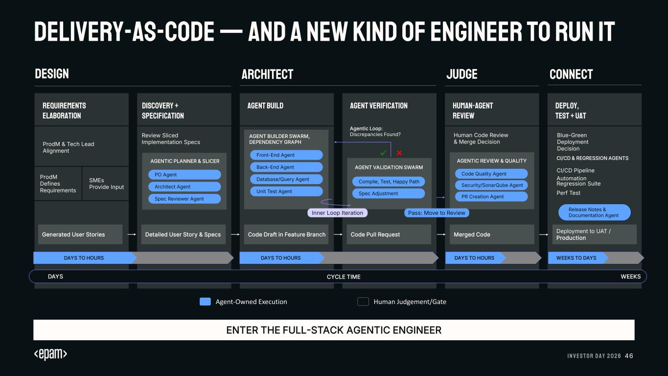 DELIVERY-AS-CODE — AND A NEW KIND OF ENGINEER TO RUN IT DESIGN Architect Requirements Elaboration Discovery + Specification Agent Build Agent Verification Human-Agent Review Deploy, Test + UAT Agent-Owned Execution Human Judgement/Gate ProdM & Tech Lead Alignment ProdM Defines Requirements SMEs Provide Input Review Sliced Implementation Specs Human Code Review & Merge Decision Blue-Green Deployment Decision Merged Code Deployment to UAT / Production Generated User Stories PO Agent Architect Agent Spec Reviewer Agent Detailed User Story & Specs Front-End Agent Back-End Agent Code Draft in Feature Branch Unit Test Agent Database/Query Agent Agentic Loop: Discrepancies Found? AGENT VALIDATION SWARM Compile, Test, Happy Path Spec Adjustment Code Pull Request AGENTIC REVIEW & QUALITY Code Quality Agent Security/SonarQube Agent PR Creation Agent CI/CD & REGRESSION AGENTS CI/CD Pipeline Automation Regression Suite Perf Test Release Notes & Documentation Agent DAYS TO HOURS DAYS TO HOURS DAYS TO HOURS WEEKS TO DAYS Pass: Move to Review WEEKSDAYS CYCLE TIME AGENTIC PLANNER & SLICER AGENT BUILDER SWARM, DEPENDENCY GRAPH Inner Loop Iteration 46 Judge connect ENTER THE FULL-STACK AGENTIC ENGINEER