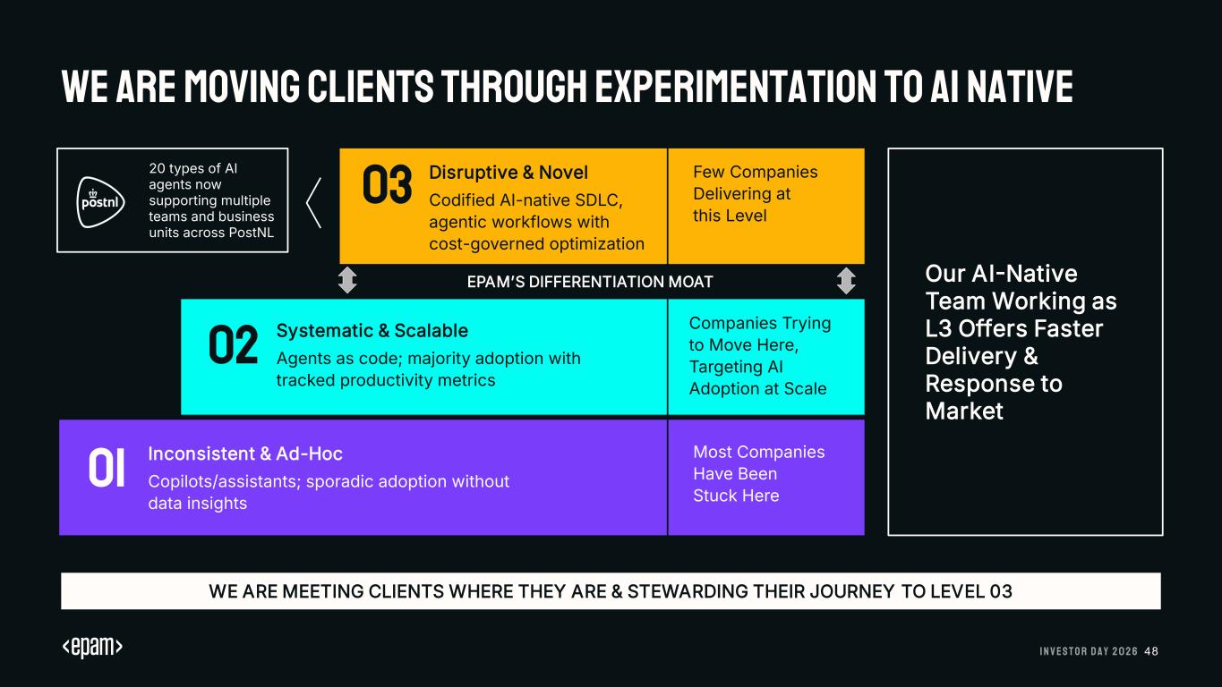 20 types of AI agents now supporting multiple teams and business units across PostNL We are moving clients through Experimentation to AI Native WE ARE MEETING CLIENTS WHERE THEY ARE & STEWARDING THEIR JOURNEY TO LEVEL 03 Our AI-Native Team Working as L3 Offers Faster Delivery & Response to Market Disruptive & Novel Codified AI-native SDLC, agentic workflows with cost-governed optimization Most Companies Have Been Stuck Here Companies Trying to Move Here, Targeting AI Adoption at Scale Few Companies Delivering at this Level 03 Systematic & Scalable Agents as code; majority adoption with tracked productivity metrics 02 Inconsistent & Ad-Hoc Copilots/assistants; sporadic adoption without data insights 01 48 EPAM’S DIFFERENTIATION MOAT
