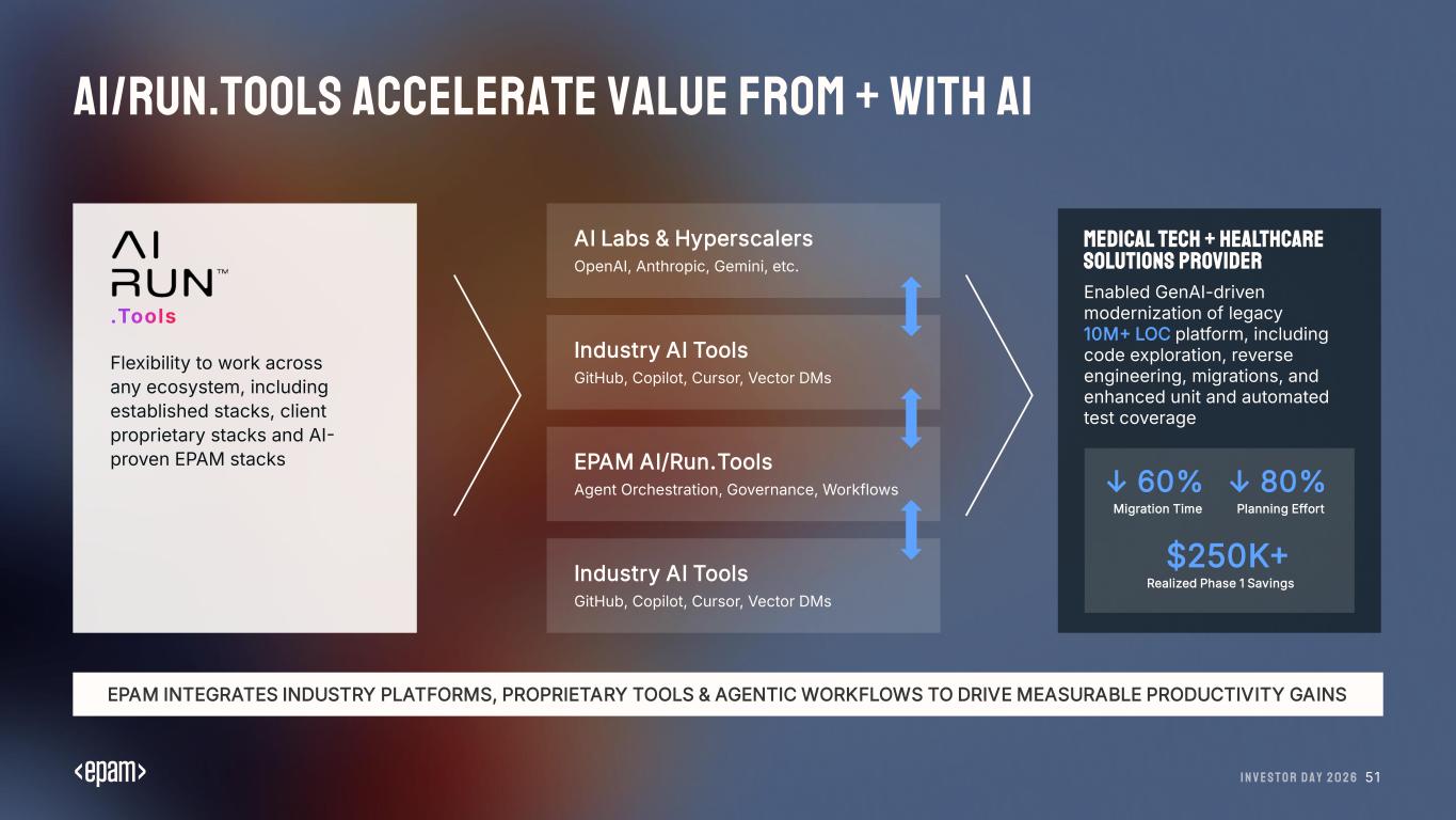 Medical tech + healthcare solutions provider Enabled GenAI-driven modernization of legacy 10M+ LOC platform, including code exploration, reverse engineering, migrations, and enhanced unit and automated test coverage AI/Run.Tools accelerate value from + WITH ai Flexibility to work across any ecosystem, including established stacks, client proprietary stacks and AI- proven EPAM stacks EPAM INTEGRATES INDUSTRY PLATFORMS, PROPRIETARY TOOLS & AGENTIC WORKFLOWS TO DRIVE MEASURABLE PRODUCTIVITY GAINS 51 AI Labs & Hyperscalers OpenAI, Anthropic, Gemini, etc. Industry AI Tools GitHub, Copilot, Cursor, Vector DMs EPAM AI/Run.Tools Agent Orchestration, Governance, Workflows Industry AI Tools GitHub, Copilot, Cursor, Vector DMs ↓ 60% Migration Time ↓ 80% Planning Effort $250K+ Realized Phase 1 Savings .Tools