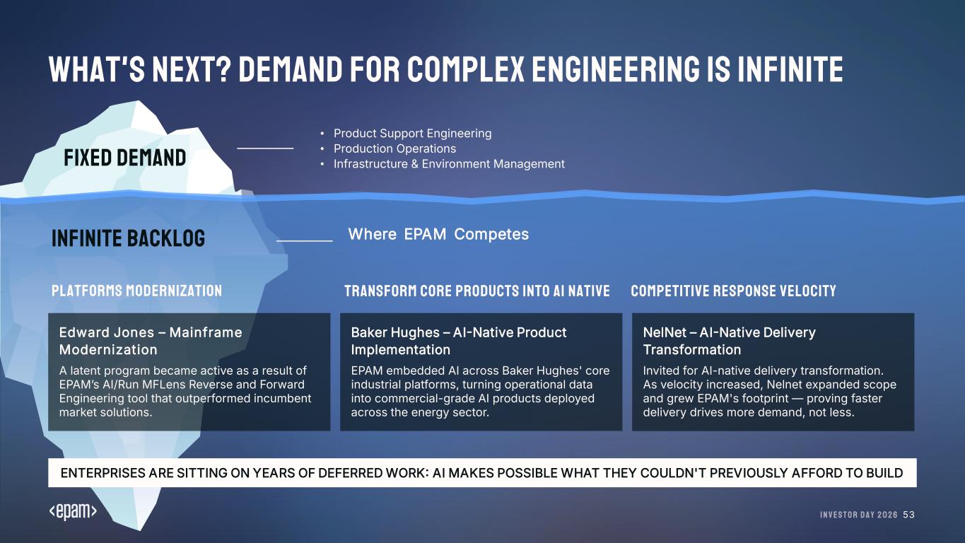 What's Next? Demand for Complex Engineering Is Infinite 53 • Product Support Engineering • Production Operations • Infrastructure & Environment ManagementFixed Demand Edward Jones – Mainframe Modernization A latent program became active as a result of EPAM’s AI/Run MFLens Reverse and Forward Engineering tool that outperformed incumbent market solutions. Baker Hughes – AI-Native Product Implementation EPAM embedded AI across Baker Hughes' core industrial platforms, turning operational data into commercial-grade AI products deployed across the energy sector. NelNet – AI-Native Delivery Transformation Invited for AI-native delivery transformation. As velocity increased, Nelnet expanded scope and grew EPAM's footprint — proving faster delivery drives more demand, not less. ENTERPRISES ARE SITTING ON YEARS OF DEFERRED WORK: AI MAKES POSSIBLE WHAT THEY COULDN'T PREVIOUSLY AFFORD TO BUILD PLATFORMS MODERNIZATION TRANSFORM CORE PRODUCTS INTO AI NATIVE Competitive Response Velocity Where EPAM CompetesInfinite Backlog