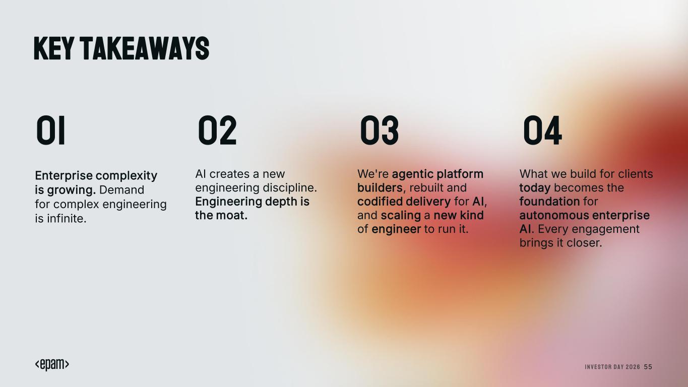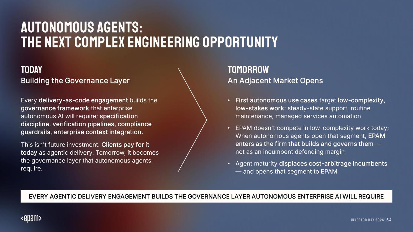 Autonomous Agents: The next complex engineering opportunity 54 Every delivery-as-code engagement builds the governance framework that enterprise autonomous AI will require; specification discipline, verification pipelines, compliance guardrails, enterprise context integration. This isn't future investment. Clients pay for it today as agentic delivery. Tomorrow, it becomes the governance layer that autonomous agents require. TOMORROW An Adjacent Market Opens • First autonomous use cases target low-complexity, low-stakes work: steady-state support, routine maintenance, managed services automation • EPAM doesn't compete in low-complexity work today; When autonomous agents open that segment, EPAM enters as the firm that builds and governs them — not as an incumbent defending margin • Agent maturity displaces cost-arbitrage incumbents — and opens that segment to EPAM TODAY Building the Governance Layer EVERY AGENTIC DELIVERY ENGAGEMENT BUILDS THE GOVERNANCE LAYER AUTONOMOUS ENTERPRISE AI WILL REQUIRE