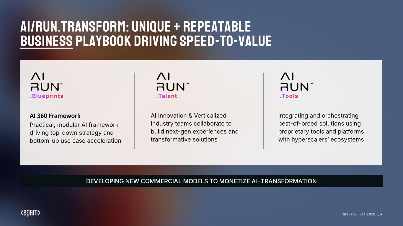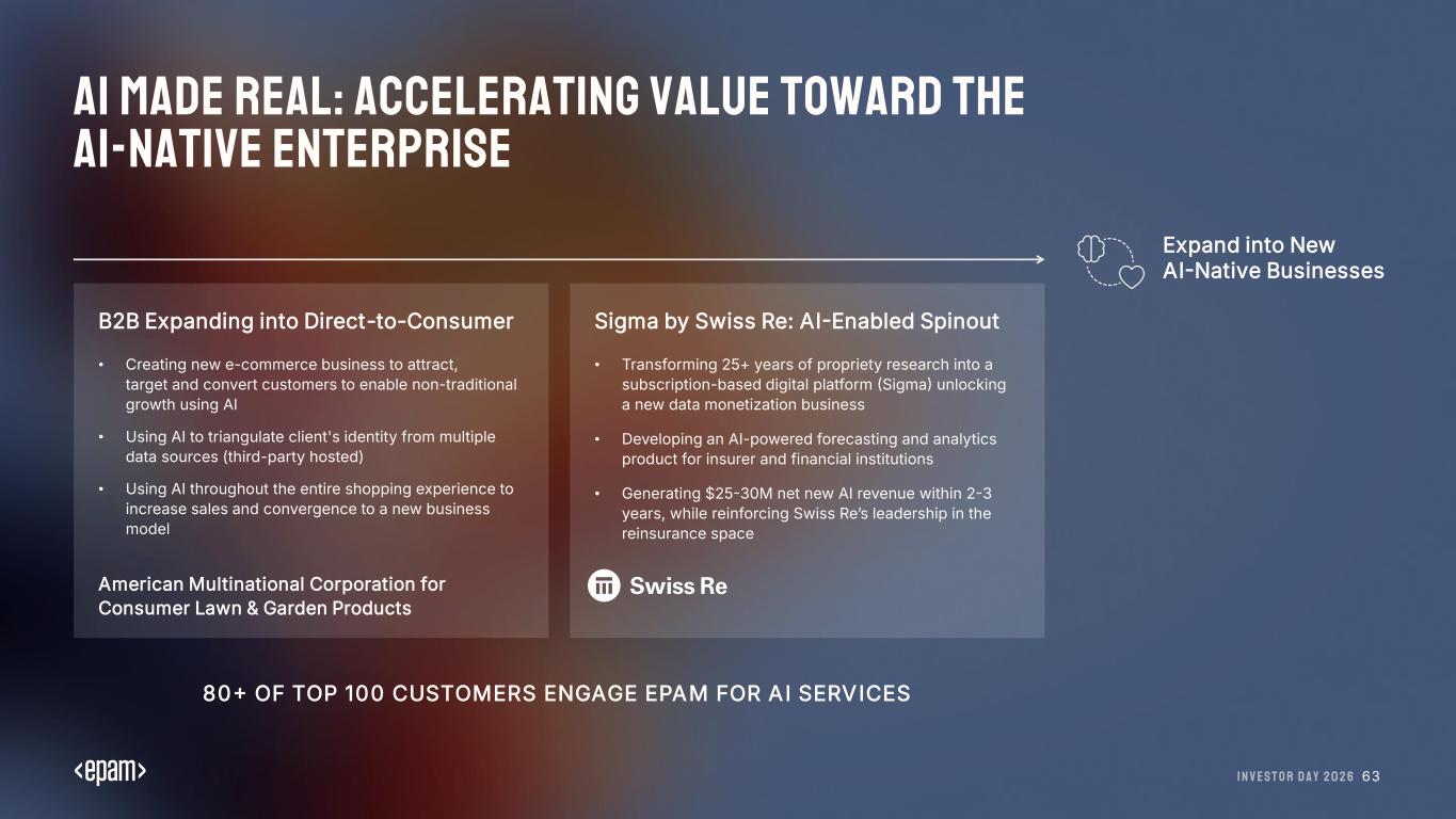 Expand into New AI-Native Businesses B2B Expanding into Direct-to-Consumer • Creating new e-commerce business to attract, target and convert customers to enable non-traditional growth using AI • Using AI to triangulate client's identity from multiple data sources (third-party hosted) • Using AI throughout the entire shopping experience to increase sales and convergence to a new business model American Multinational Corporation for Consumer Lawn & Garden Products Sigma by Swiss Re: AI-Enabled Spinout • Transforming 25+ years of propriety research into a subscription-based digital platform (Sigma) unlocking a new data monetization business • Developing an AI-powered forecasting and analytics product for insurer and financial institutions • Generating $25-30M net new AI revenue within 2-3 years, while reinforcing Swiss Re’s leadership in the reinsurance space 80+ OF TOP 100 CUSTOMERS ENGAGE EPAM FOR AI SERVICES AI made real: Accelerating Value toward the AI-Native Enterprise 63