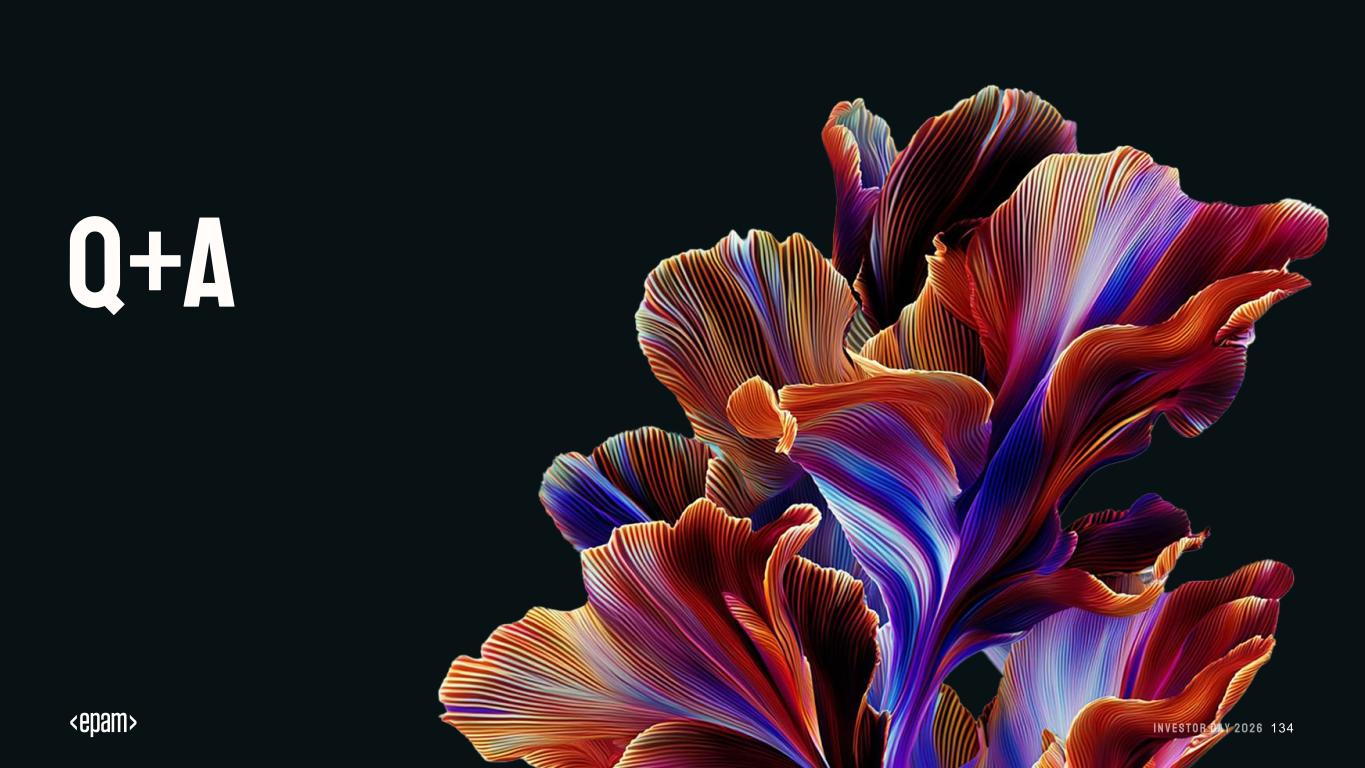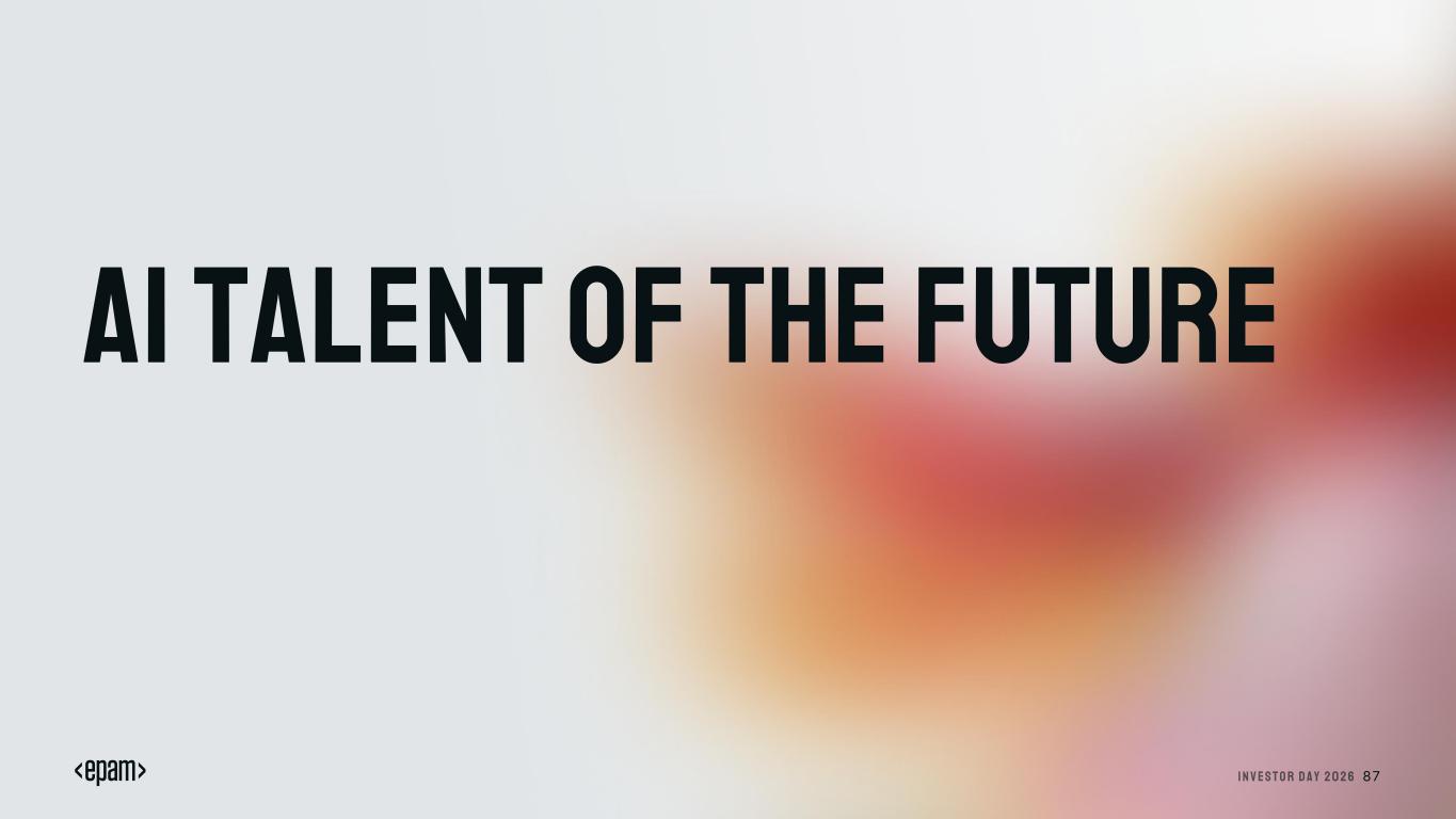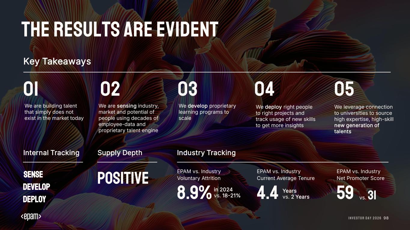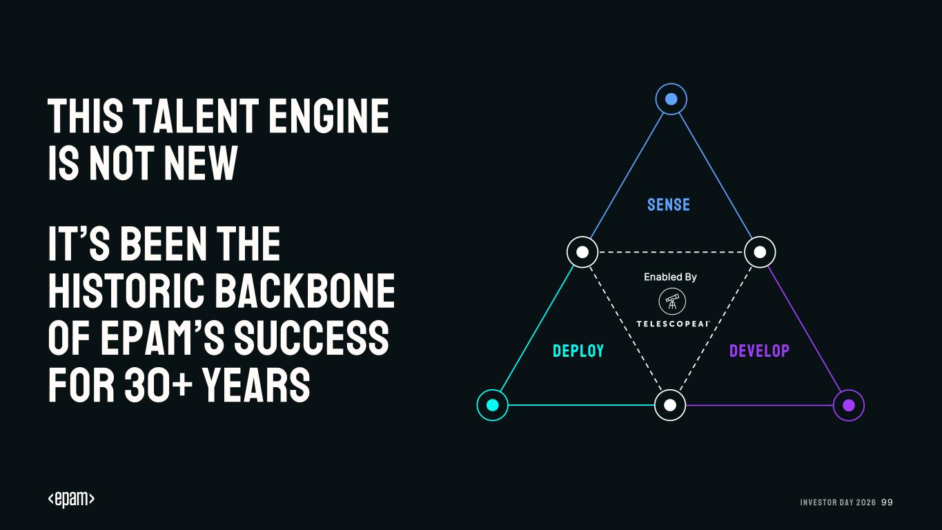 98 The results are evident WIP: Update PLACEHOLDER internal stats; Update industry stats for 2025 Key Takeaways 01 02 03 04 We are building talent that simply does not exist in the market today We are sensing industry, market and potential of people using decades of employee-data and proprietary talent engine We deploy right people to right projects and track usage of new skills to get more insights We develop proprietary learning programs to scale 05 We leverage connection to universities to source high expertise, high-skill new generation of talents Internal Tracking Industry Tracking EPAM vs. Industry Voluntary Attrition 8.9% EPAM vs. Industry Current Average Tenure 4.4 EPAM vs. Industry Net Promoter Score 59 in 2024 vs. 18-21% Years vs. 2 Years vs. 31 SENSE DEVELOP DEPLOY POSITIVE Supply Depth