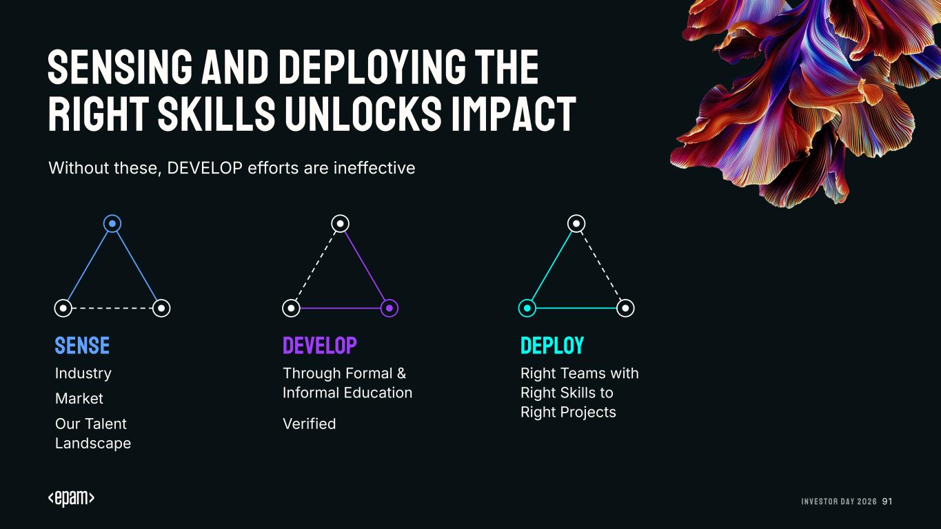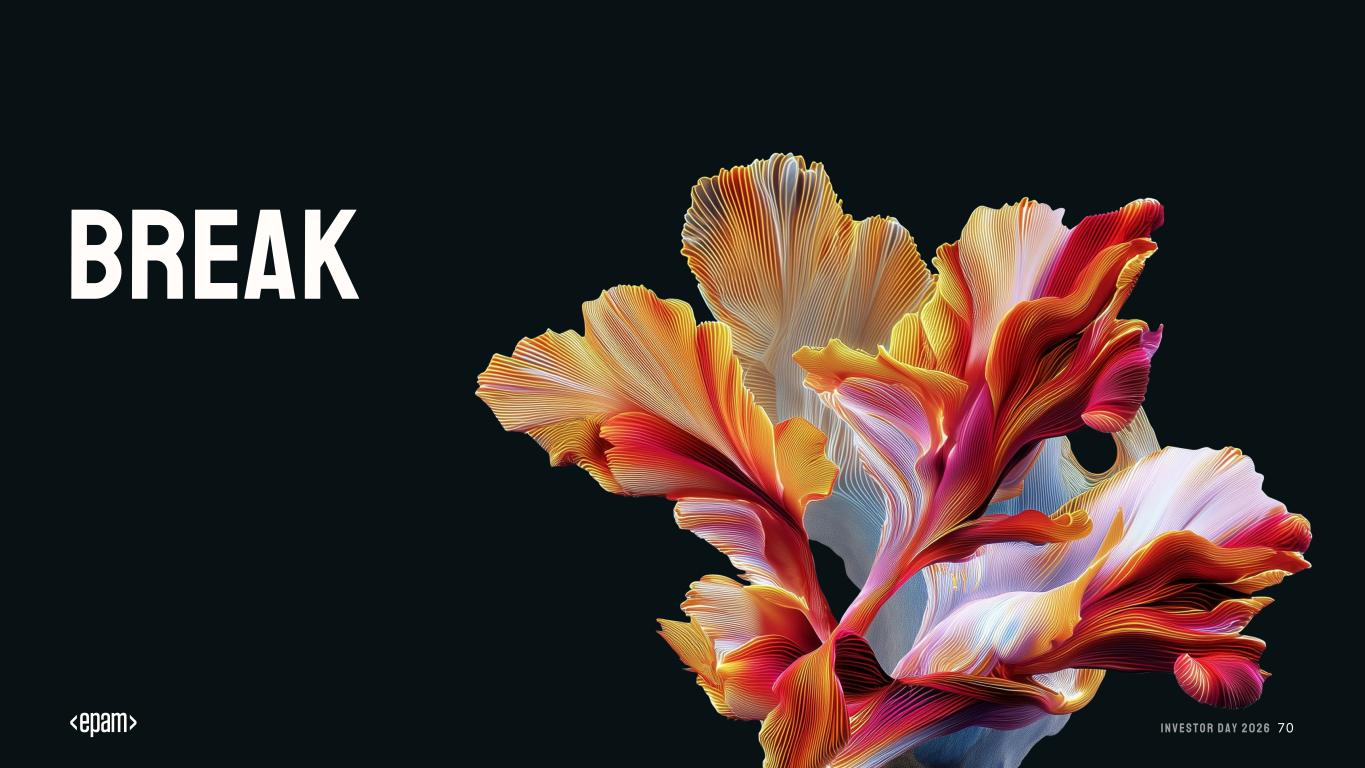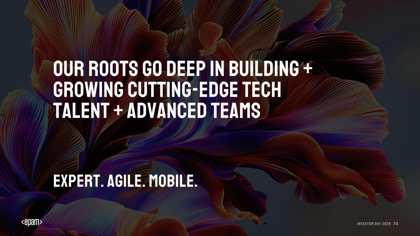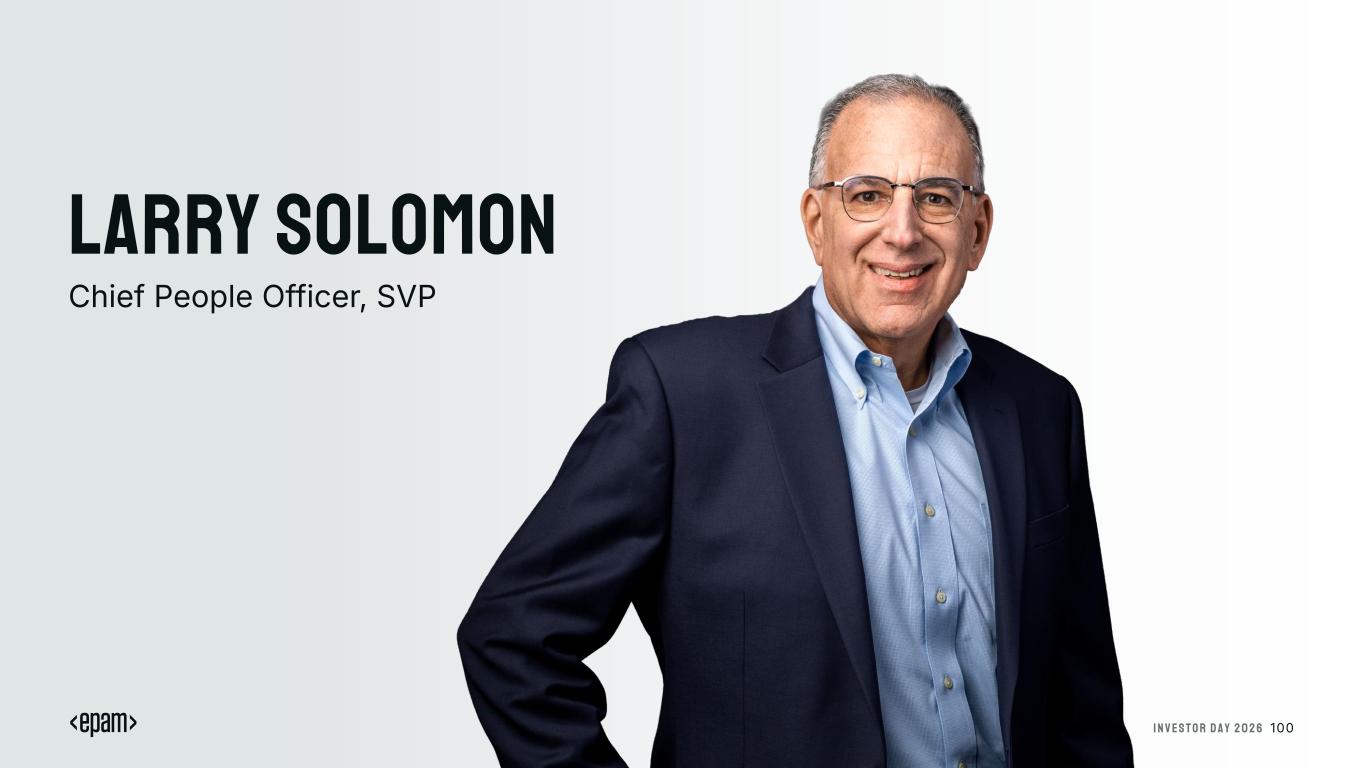 98 The results are evident WIP: Update PLACEHOLDER internal stats; Update industry stats for 2025 Key Takeaways 01 02 03 04 We are building talent that simply does not exist in the market today We are sensing industry, market and potential of people using decades of employee-data and proprietary talent engine We deploy right people to right projects and track usage of new skills to get more insights We develop proprietary learning programs to scale 05 We leverage connection to universities to source high expertise, high-skill new generation of talents Internal Tracking Industry Tracking EPAM vs. Industry Voluntary Attrition 8.9% EPAM vs. Industry Current Average Tenure 4.4 EPAM vs. Industry Net Promoter Score 59 in 2024 vs. 18-21% Years vs. 2 Years vs. 31 SENSE DEVELOP DEPLOY POSITIVE Supply Depth