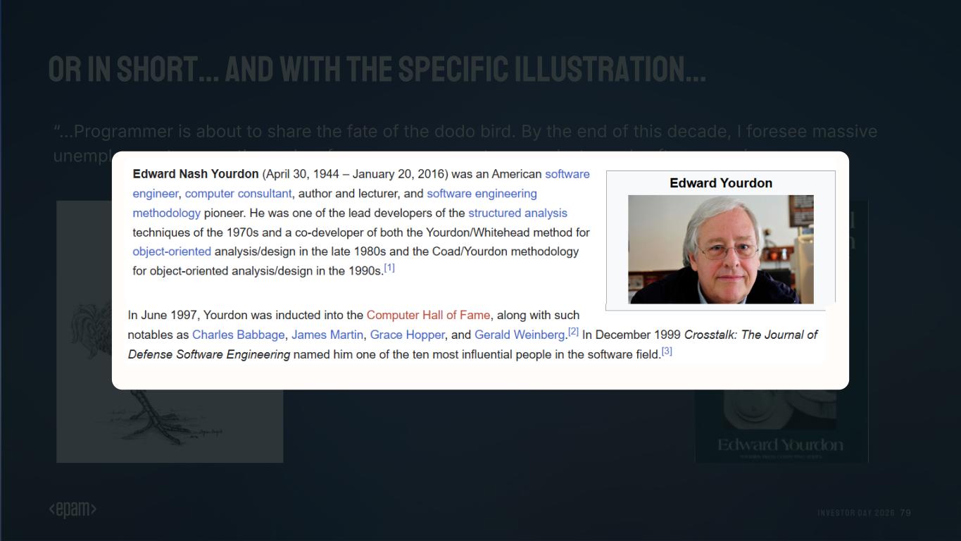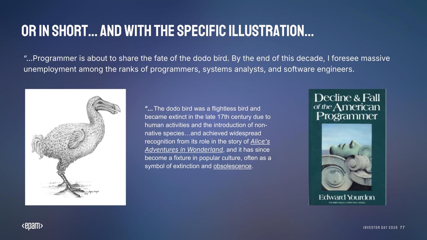 Or in short… And with the specific illustration… 79 “…Programmer is about to share the fate of the dodo bird. By the end of this decade, I foresee massive unemployment among the ranks of programmers, systems analysts, and software engineers. “…The dodo bird was a flightless bird and became extinct in the late 17th century due to human activities and the introduction of non- native species…and achieved widespread recognition from its role in the story of Alice's Adventures in Wonderland, and it has since become a fixture in popular culture, often as a symbol of extinction and obsolescence.