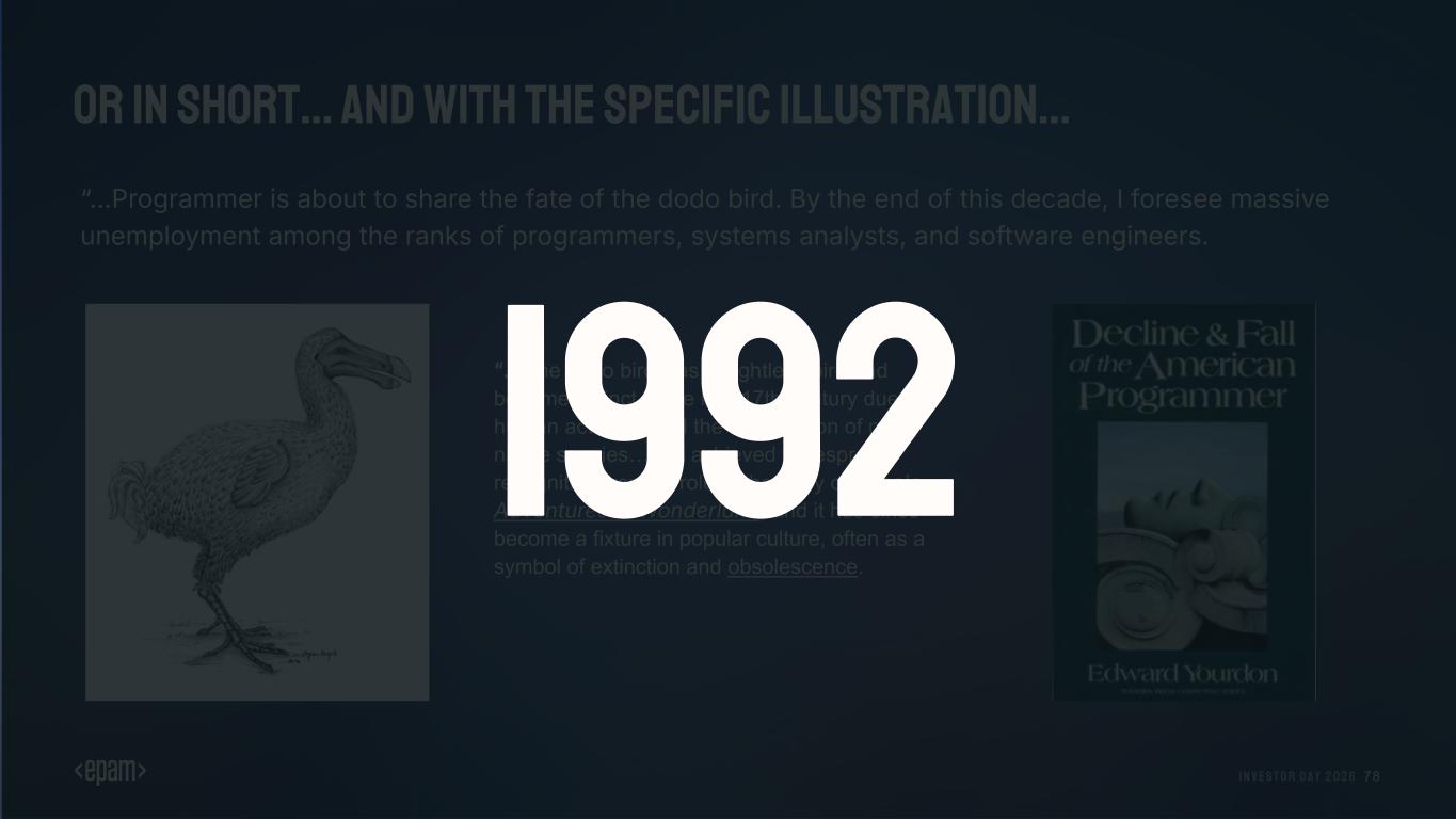 Or in short… And with the specific illustration… 77 “…Programmer is about to share the fate of the dodo bird. By the end of this decade, I foresee massive unemployment among the ranks of programmers, systems analysts, and software engineers. “…The dodo bird was a flightless bird and became extinct in the late 17th century due to human activities and the introduction of non- native species…and achieved widespread recognition from its role in the story of Alice's Adventures in Wonderland, and it has since become a fixture in popular culture, often as a symbol of extinction and obsolescence.
