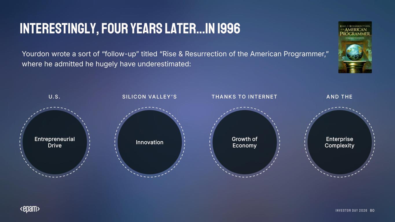 Interestingly, Four Years Later…in 1996 80 Yourdon wrote a sort of “follow-up” titled “Rise & Resurrection of the American Programmer,” where he admitted he hugely have underestimated: Entrepreneurial Drive U. S . Innovation S IL ICON VA LLEY ’ S Growth of Economy T HA NK S TO INT ERNET Enterprise Complexity A ND T HE