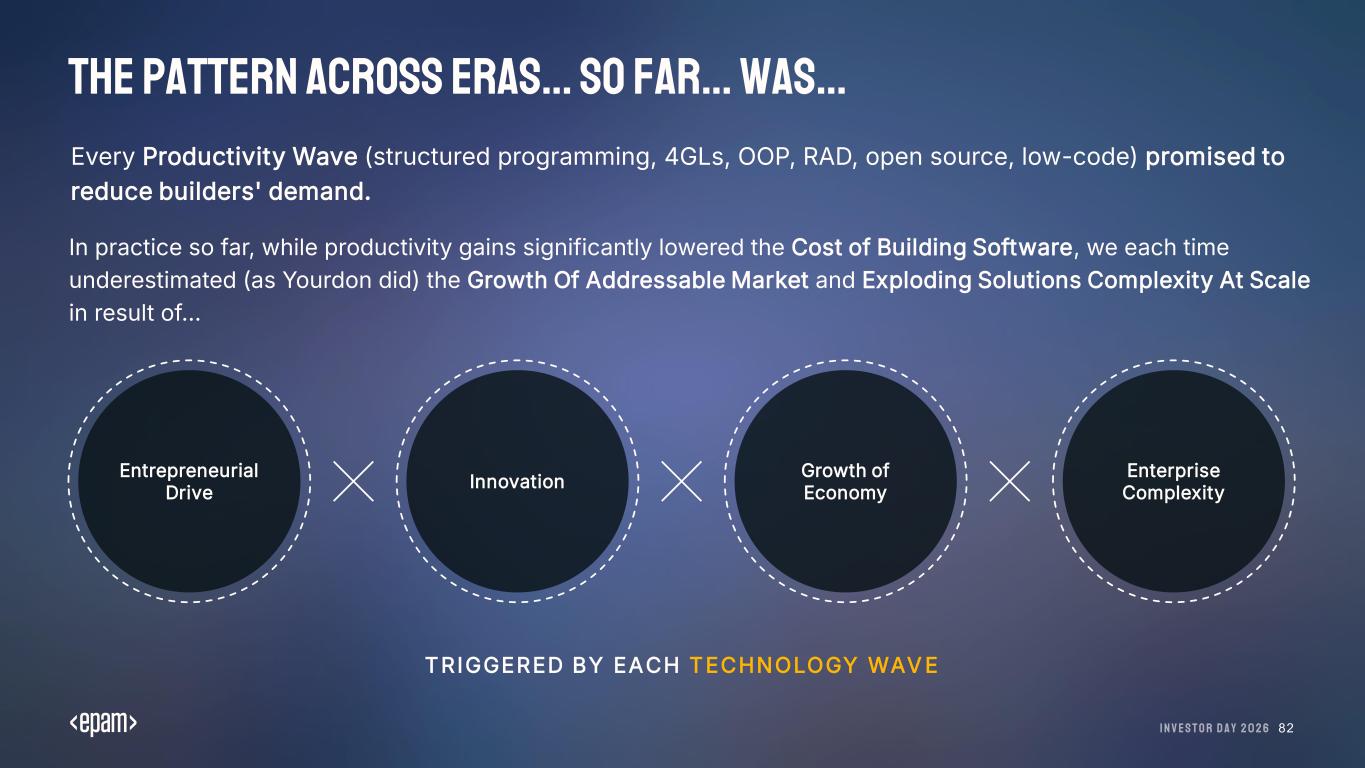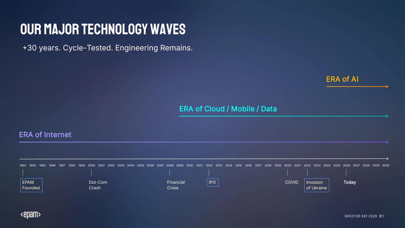 Our Major Technology Waves 81 ERA of Internet ERA of Cloud / Mobile / Data ERA of AI EPAM Founded Dot-Com Crash Financial Crisis IPO COVID Invasion of Ukraine Today +30 years. Cycle-Tested. Engineering Remains.
