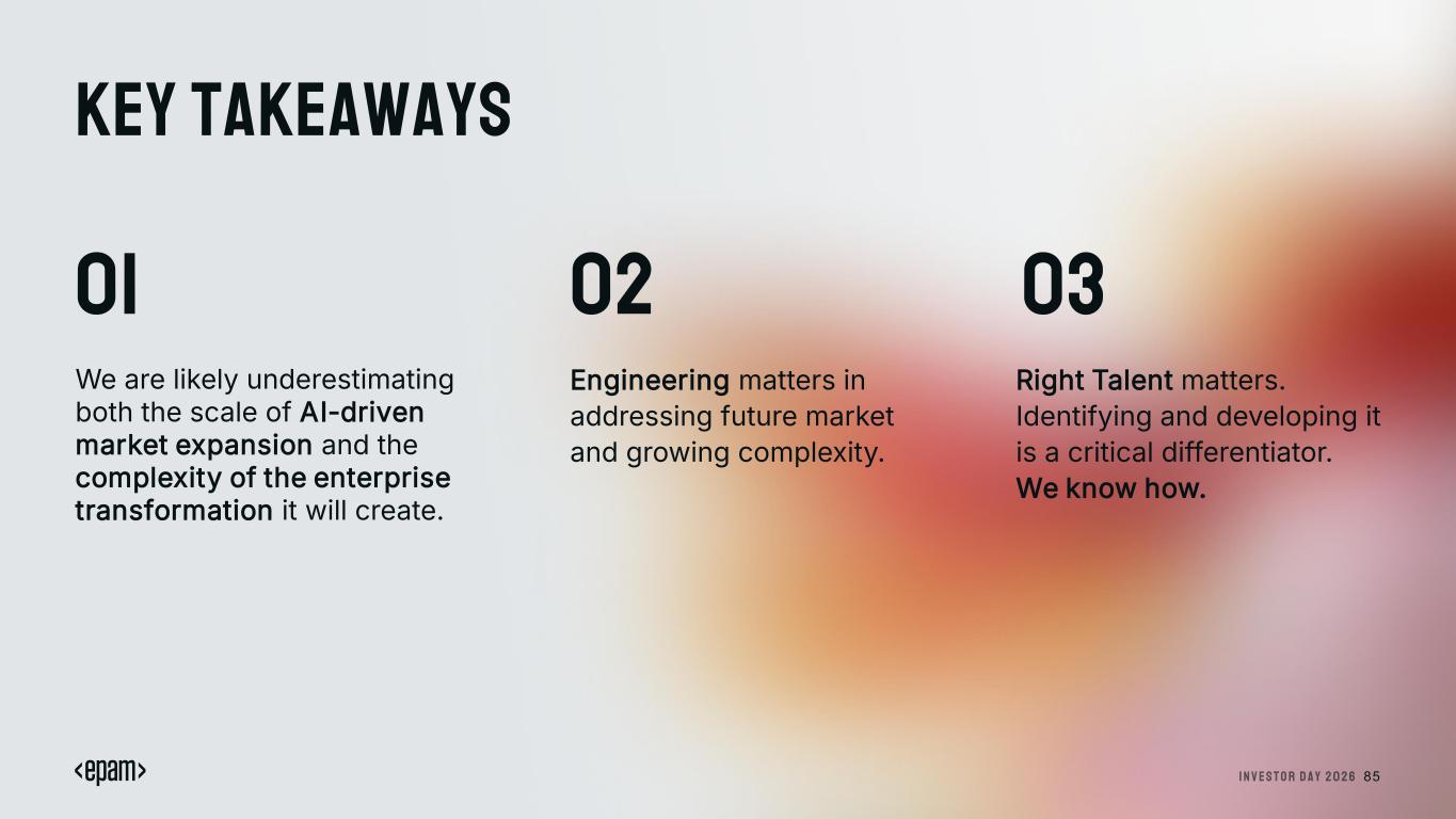 Key takeaways 85 01 We are likely underestimating both the scale of AI-driven market expansion and the complexity of the enterprise transformation it will create. 02 Engineering matters in addressing future market and growing complexity. 03 Right Talent matters. Identifying and developing it is a critical differentiator. We know how.