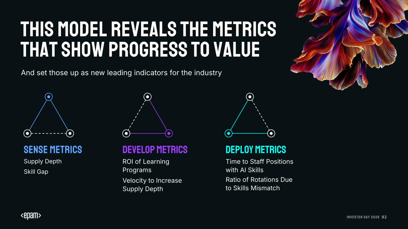 this model REVEALS the metrics that SHOW progress to value And set those up as new leading indicators for the industry Deploy Metrics Time to Staff Positions with AI Skills Ratio of Rotations Due to Skills Mismatch Sense Metrics Supply Depth Skill Gap Develop Metrics ROI of Learning Programs Velocity to Increase Supply Depth 92
