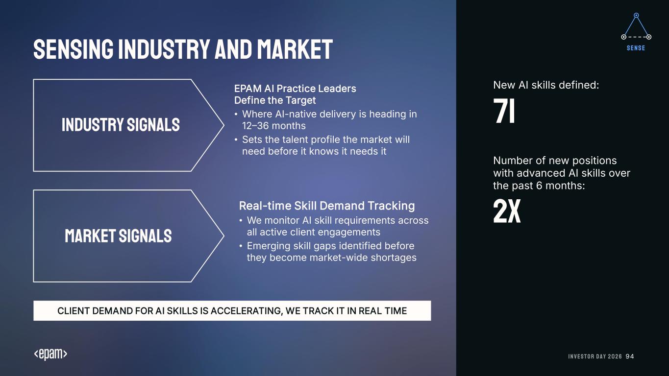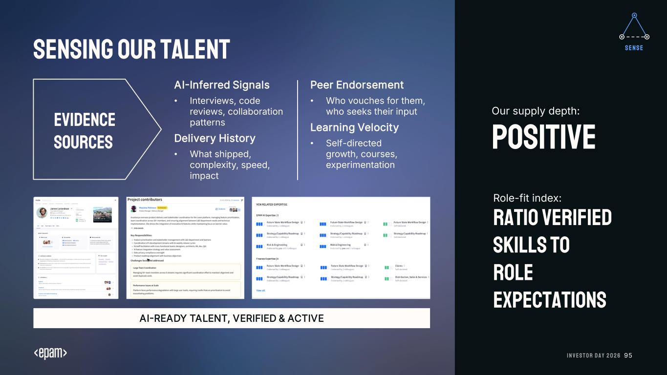 SENSING INDUSTRY AND MARKET 94 CLIENT DEMAND FOR AI SKILLS IS ACCELERATING, WE TRACK IT IN REAL TIME EPAM AI Practice Leaders Define the Target • Where AI-native delivery is heading in 12–36 months • Sets the talent profile the market will need before it knows it needs it INDUSTRY SIGNALS MARKET SIGNALS Real-time Skill Demand Tracking • We monitor AI skill requirements across all active client engagements • Emerging skill gaps identified before they become market-wide shortages S E N S E New AI skills defined: 71 Number of new positions with advanced AI skills over the past 6 months: 2x