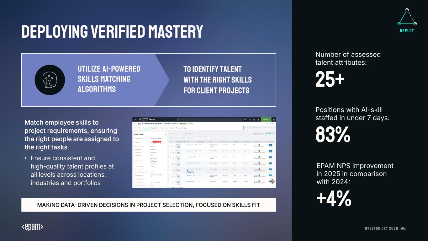 Deploying verified mastery 96 MAKING DATA-DRIVEN DECISIONS IN PROJECT SELECTION, FOCUSED ON SKILLS FIT Number of assessed talent attributes: 25+ EPAM NPS improvement in 2025 in comparison with 2024: +4% Utilize AI-Powered Skills Matching Algorithms to Identify TALENT with THE Right Skills for Client Projects Match employee skills to project requirements, ensuring the right people are assigned to the right tasks • Ensure consistent and high-quality talent profiles at all levels across locations, industries and portfolios WIP: Update image with high-res version; Note: Image from slide 23 from “How EPAM Operates as a Skills-Based Organization” Aleksey: I have updated picture with high-res from staffing, covered sensitive information. Please replace if you see it necessary Positions with AI-skill staffed in under 7 days: 83% D E P L O Y