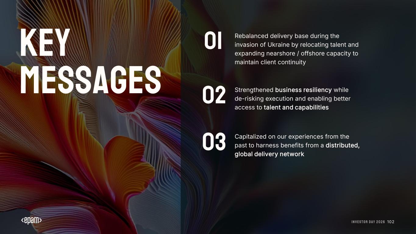 Key messages Rebalanced delivery base during the invasion of Ukraine by relocating talent and expanding nearshore / offshore capacity to maintain client continuity 01 Strengthened business resiliency while de-risking execution and enabling better access to talent and capabilities Capitalized on our experiences from the past to harness benefits from a distributed, global delivery network 02 03 102