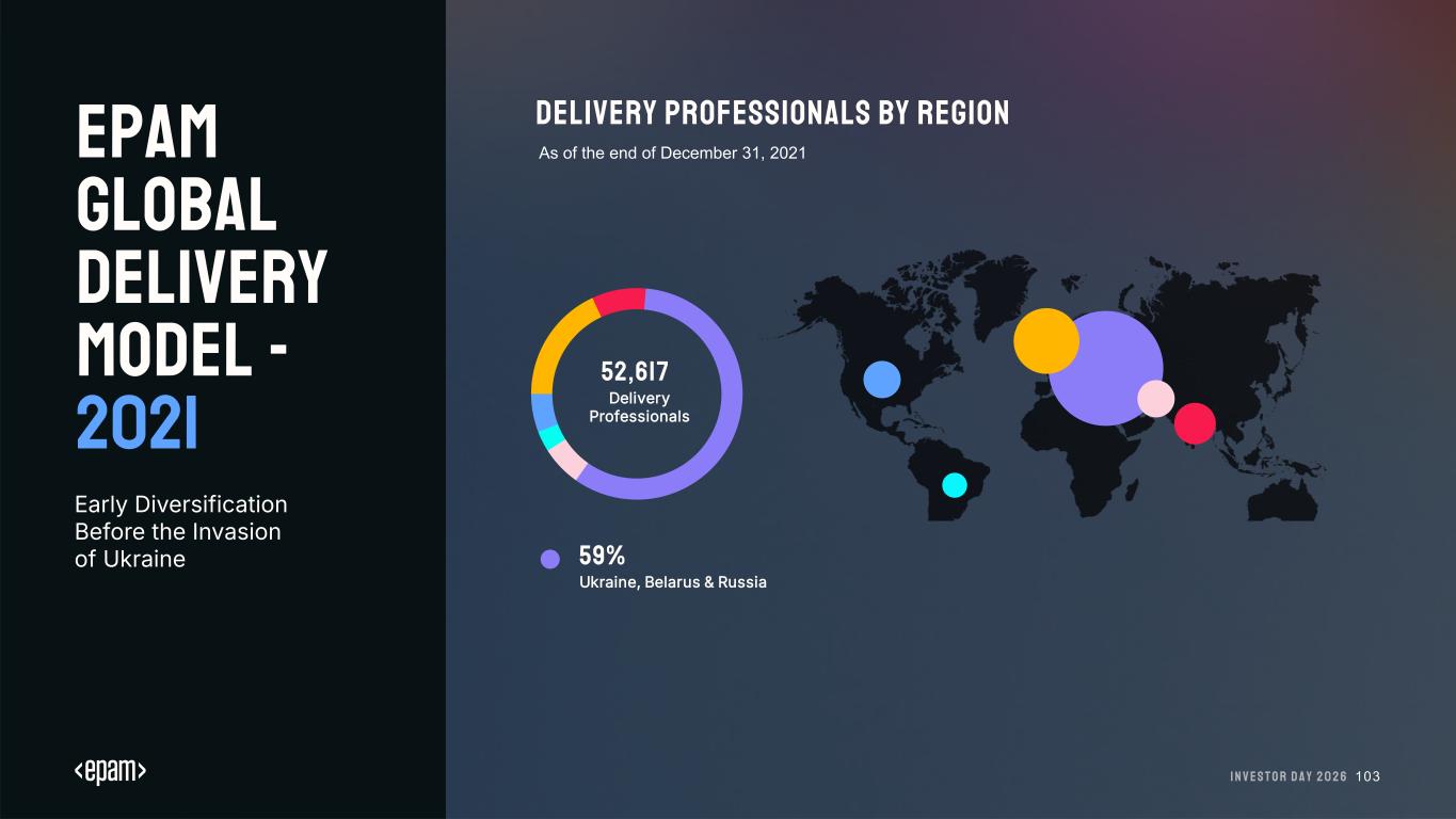 Delivery Professionals By Region As of the end of December 31, 2021 59% Ukraine, Belarus & Russia EPAM Global Delivery Model - 2021 Early Diversification Before the Invasion of Ukraine 52,617 Delivery Professionals 103