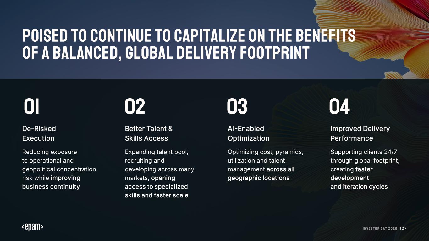 01 02 03 04 Better Talent & Skills Access Expanding talent pool, recruiting and developing across many markets, opening access to specialized skills and faster scale AI-Enabled Optimization Optimizing cost, pyramids, utilization and talent management across all geographic locations Improved Delivery Performance Supporting clients 24/7 through global footprint, creating faster development and iteration cycles Poised to Continue to Capitalize on the Benefits of a Balanced, Global Delivery Footprint De-Risked Execution Reducing exposure to operational and geopolitical concentration risk while improving business continuity 107