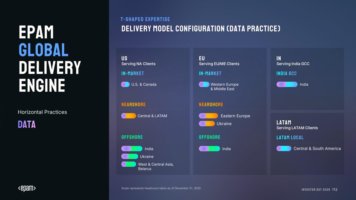 EPAM Global Delivery ENGINE 111 TALENT + Delivery MODEL CONFIGURATIONS B A L A N C E D + R E S I L I E N T Optimized & Balanced for Delivery Excellence US Serving NA Clients IN- MARKET NEARSHORE OFFSHORE U.S. & Canada Central & LATAM India Ukraine West & Central Asia, Belarus EU Serving EU / ME Clients IN- MARKET NEARSHORE OFFSHORE Western Europe & Middle East Eastern Europe India Ukraine IN Serving India GCC INDIA GCC India LATAM Serving LATAM Clients LATAM local Central & South America