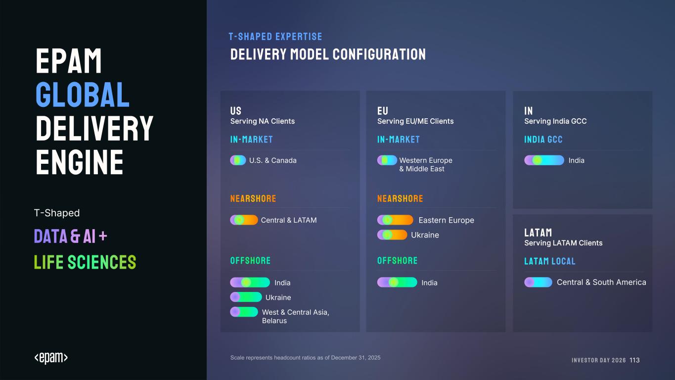 EPAM Global Delivery ENGINE 112 Delivery MODEL CONFIGURATION (Data Practice) T - S H A P E D E X P E R T I S E Horizontal Practices Data US Serving NA Clients IN- MARKET NEARSHORE OFFSHORE U.S. & Canada Central & LATAM India Ukraine West & Central Asia, Belarus EU Serving EU/ME Clients IN- MARKET NEARSHORE OFFSHORE Western Europe & Middle East Eastern Europe India Ukraine IN Serving India GCC INDIA GCC India LATAM Serving LATAM Clients LATAM local Central & South America