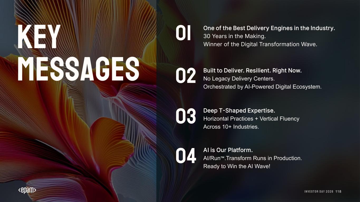 Key messages One of the Best Delivery Engines in the Industry. 30 Years in the Making. Winner of the Digital Transformation Wave. 01 02 Built to Deliver. Resilient. Right Now. No Legacy Delivery Centers. Orchestrated by AI-Powered Digital Ecosystem. 03 Deep T-Shaped Expertise. Horizontal Practices + Vertical Fluency Across 10+ Industries. 04 AI is Our Platform. AI/Run .Transform Runs in Production. Ready to Win the AI Wave! 118