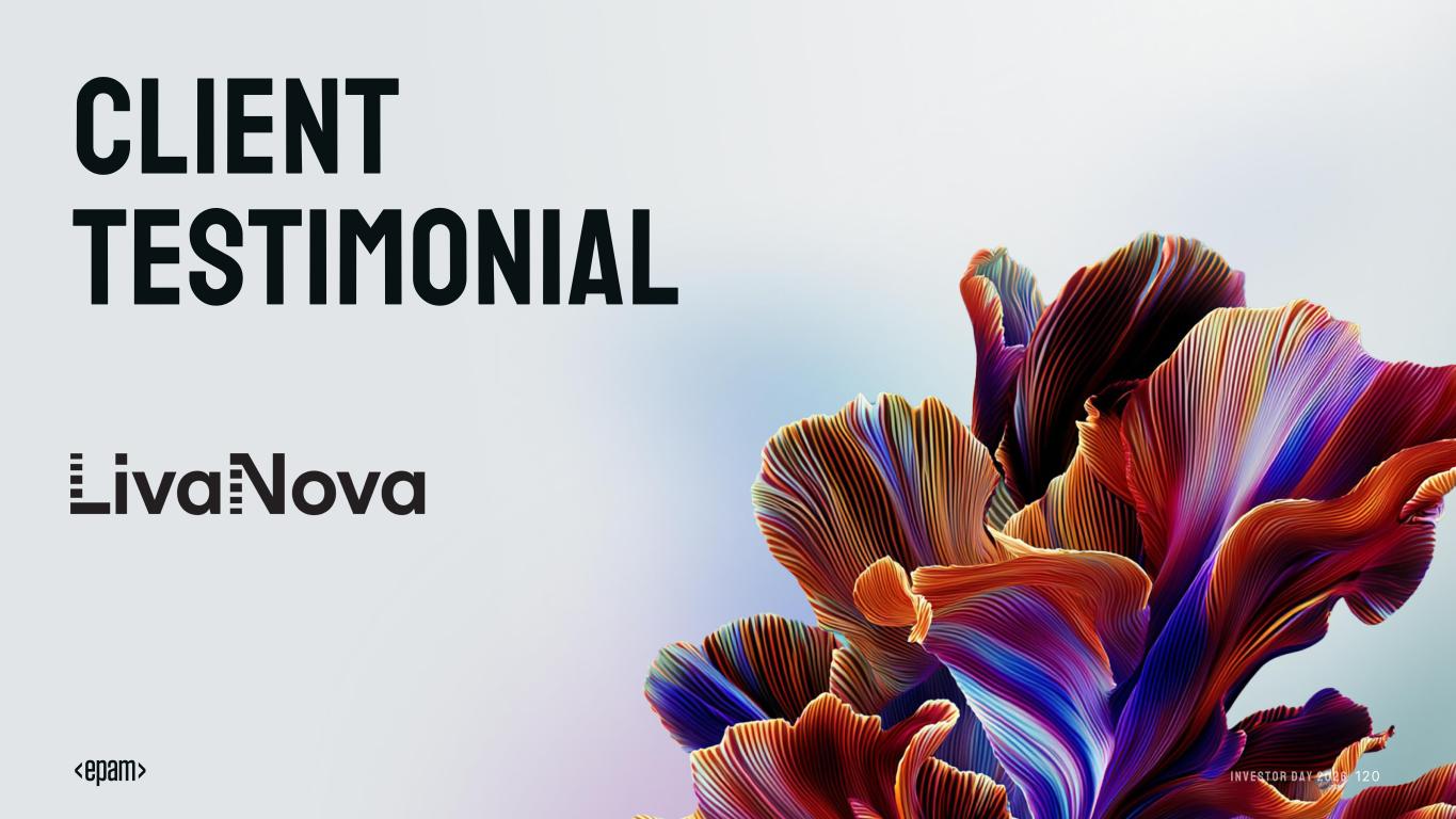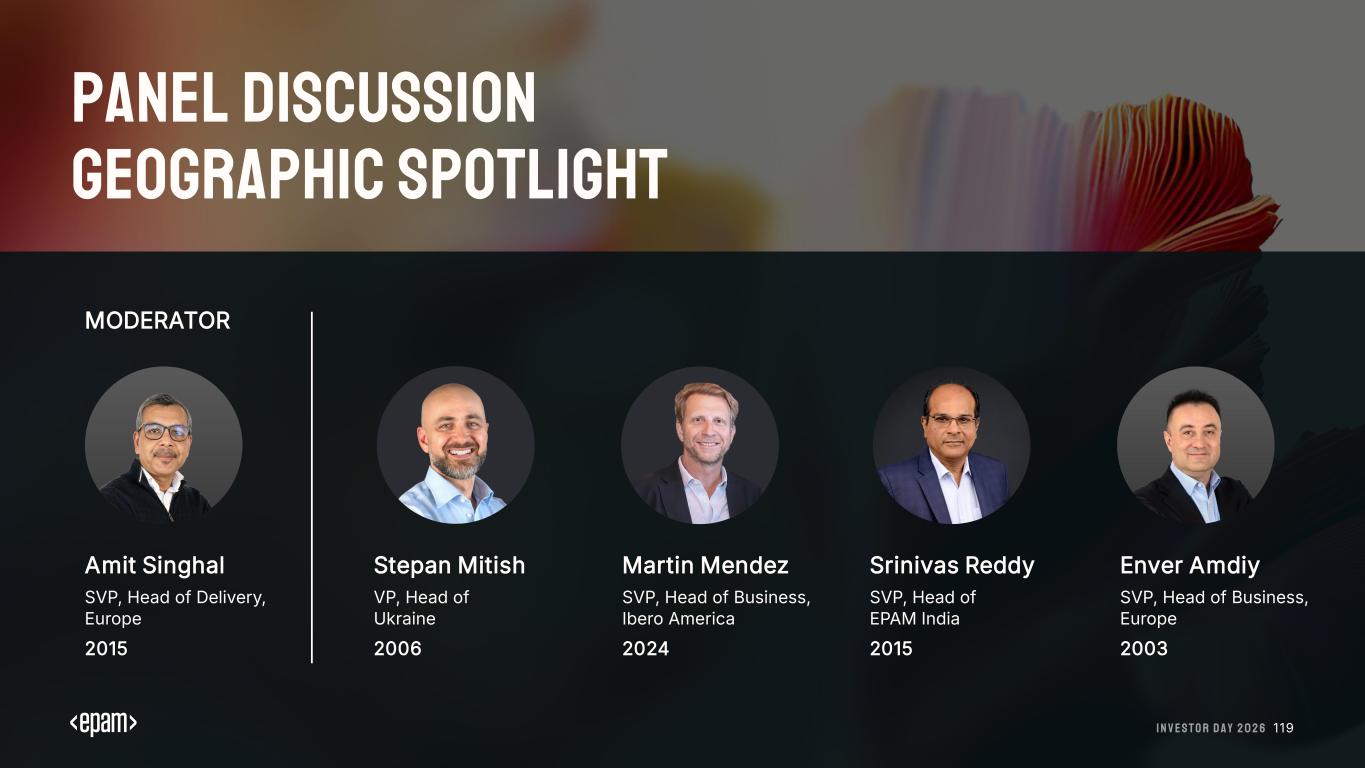 Panel discussion Geographic spotlight Srinivas Reddy SVP, Head of EPAM India 2015 Enver Amdiy SVP, Head of Business, Europe 2003 Stepan Mitish VP, Head of Ukraine 2006 Martin Mendez SVP, Head of Business, Ibero America 2024 MODERATOR Amit Singhal SVP, Head of Delivery, Europe 2015 119