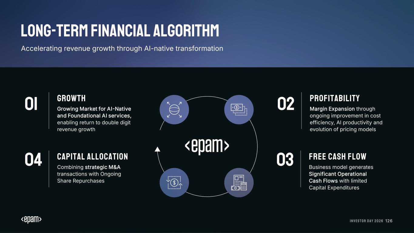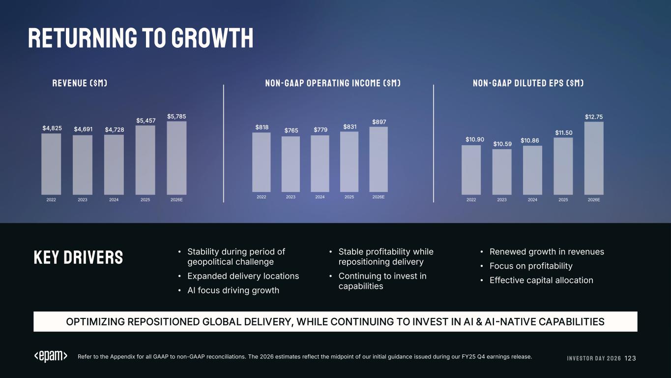 Revenue ($M) Non - GAAP Operating Income ($M) Non - GAAP Diluted EPS ($M) Returning to growth • Stability during period of geopolitical challenge • Expanded delivery locations • AI focus driving growth • Stable profitability while repositioning delivery • Continuing to invest in capabilities • Renewed growth in revenues • Focus on profitability • Effective capital allocation Key drivers OPTIMIZING REPOSITIONED GLOBAL DELIVERY, WHILE CONTINUING TO INVEST IN AI & AI-NATIVE CAPABILITIES 123 $4,825 $4,691 $4,728 $5,457 $5,785 2022 2023 2024 2025 2026E $10.90 $10.59 $10.86 $11.50 $12.75 2022 2023 2024 2025 2026E $818 $765 $779 $831 $897 5% 6% 7% 8% 9% 10% 11% 12% 13% 14% 15% 16% 17% 18% 19% 20% 21% 22% 23% 24% 25% 26% 27% 28% 29% 30% $- $100 $200 $300 $400 $500 $600 $700 $800 $900 $1,000 2022 2023 2024 2025 2026E Refer to the Appendix for all GAAP to non-GAAP reconciliations. The 2026 estimates reflect the midpoint of our initial guidance issued during our FY25 Q4 earnings release.