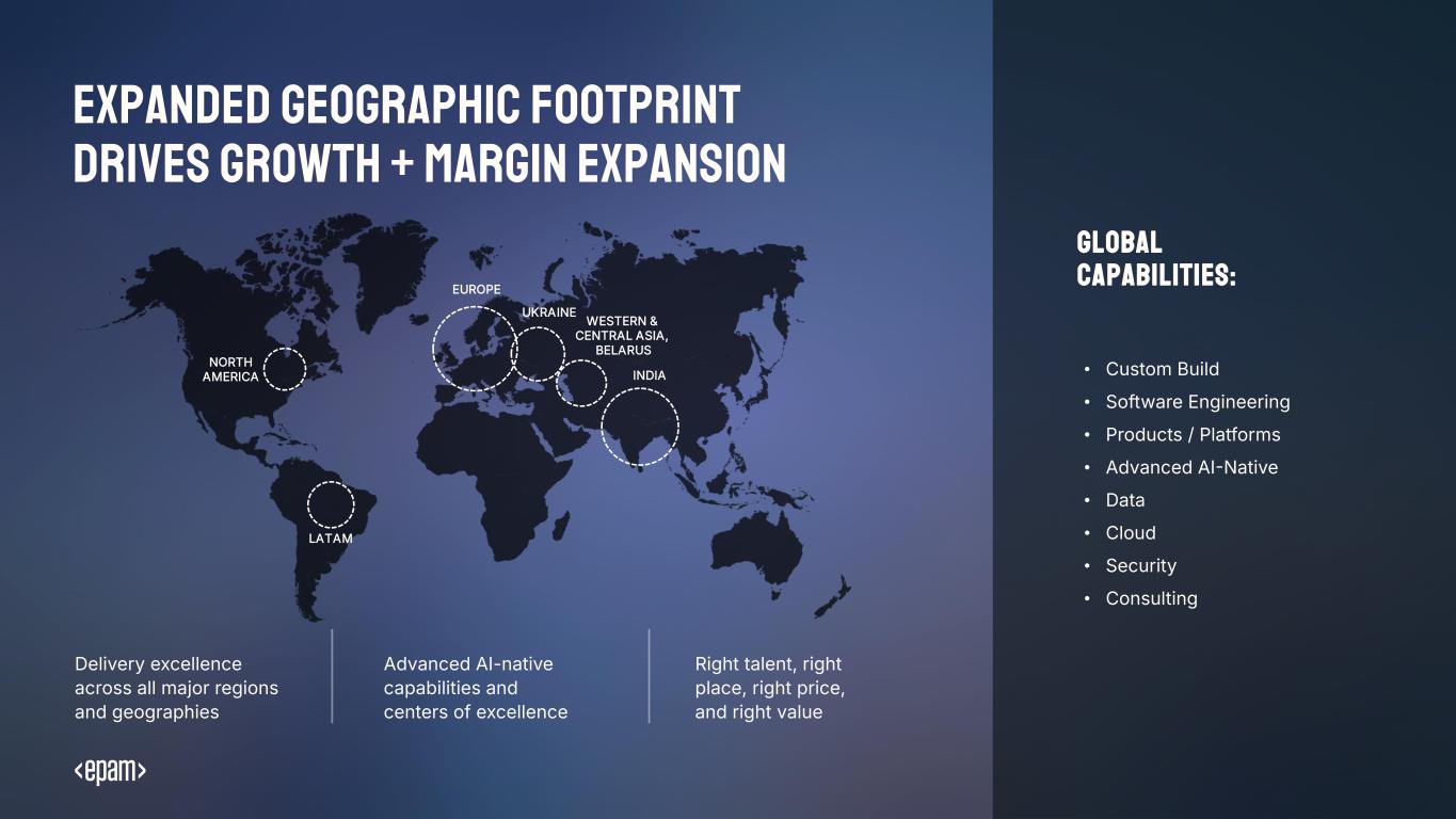 Expanded Geographic Footprint Drives Growth + Margin Expansion Global Capabilities: • Custom Build • Software Engineering • Products / Platforms • Advanced AI-Native • Data • Cloud • Security • Consulting Right talent, right place, right price, and right value Advanced AI-native capabilities and centers of excellence Delivery excellence across all major regions and geographies EUROPE UKRAINE WESTERN & CENTRAL ASIA, BELARUS INDIA LATAM NORTH AMERICA