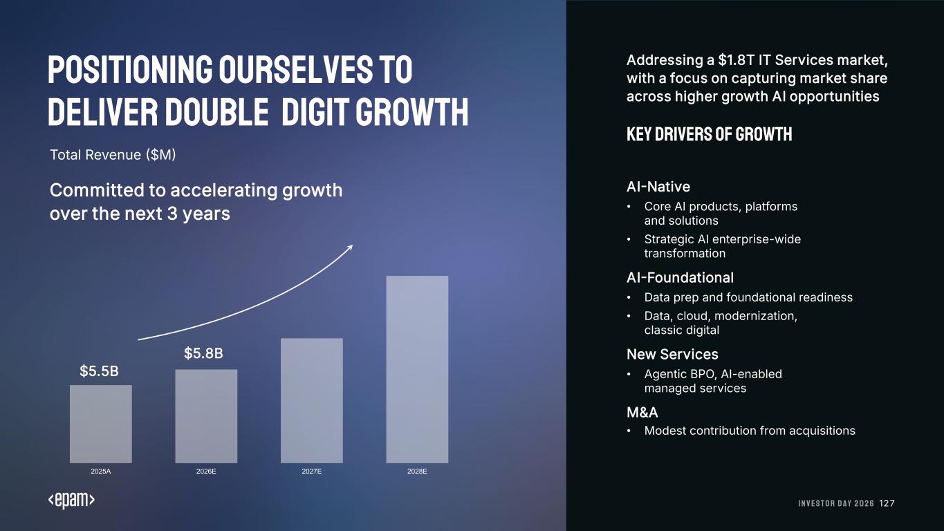 Key Drivers Of Growth AI-Native • Core AI products, platforms and solutions • Strategic AI enterprise-wide transformation AI-Foundational • Data prep and foundational readiness • Data, cloud, modernization, classic digital New Services • Agentic BPO, AI-enabled managed services M&A • Modest contribution from acquisitions Positioning ourselves to deliver double digit growth Committed to accelerating growth over the next 3 years Total Revenue ($M) 127 2025A 2026E 2027E 2028E Addressing a $1.8T IT Services market, with a focus on capturing market share across higher growth AI opportunities $5.5B $5.8B