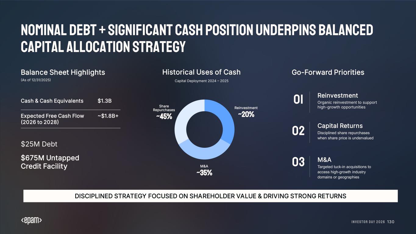 Nominal Debt + Significant Cash Position Underpins Balanced Capital Allocation Strategy Go-Forward Priorities 01 Reinvestment Organic reinvestment to support high-growth opportunities Capital Returns Disciplined share repurchases when share price is undervalued 02 M&A Targeted tuck-in acquisitions to access high-growth industry domains or geographies 03 Balance Sheet Highlights (As of 12/31/2025) Cash & Cash Equivalents $1.3B Expected Free Cash Flow (2026 to 2028) ~$1.8B+ $25M Debt $675M Untapped Credit Facility Historical Uses of Cash Capital Deployment 2024 – 2025 130 Reinvestment ~20% M&A ~35% Share Repurchases ~45% DISCIPLINED STRATEGY FOCUSED ON SHAREHOLDER VALUE & DRIVING STRONG RETURNS