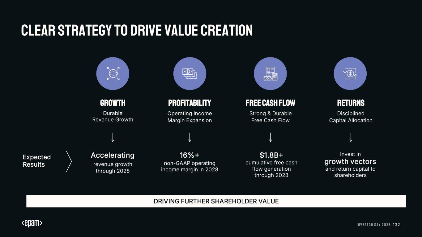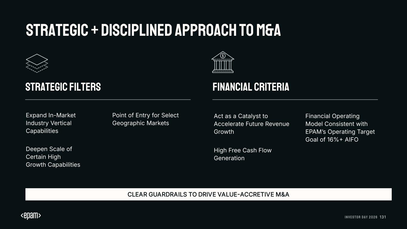 Act as a Catalyst to Accelerate Future Revenue Growth Financial Operating Model Consistent with EPAM’s Operating Target Goal of 16%+ AIFO High Free Cash Flow Generation Strategic + Disciplined Approach to M&A Strategic Filters Financial Criteria Expand In-Market Industry Vertical Capabilities Point of Entry for Select Geographic Markets Deepen Scale of Certain High Growth Capabilities 131 CLEAR GUARDRAILS TO DRIVE VALUE-ACCRETIVE M&A