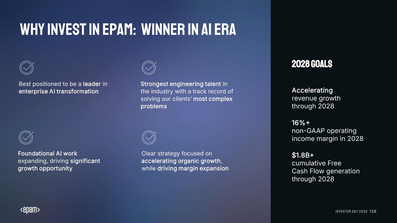 Why Invest in EPAM: Winner in AI Era 138 Best positioned to be a leader in enterprise AI transformation Foundational AI work expanding, driving significant growth opportunity Strongest engineering talent in the industry with a track record of solving our clients’ most complex problems Clear strategy focused on accelerating organic growth, while driving margin expansion Accelerating revenue growth through 2028 16%+ non-GAAP operating income margin in 2028 $1.8B+ cumulative Free Cash Flow generation through 2028 2028 GOALS