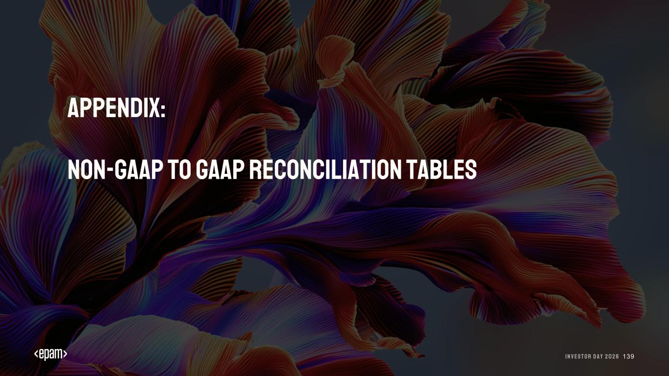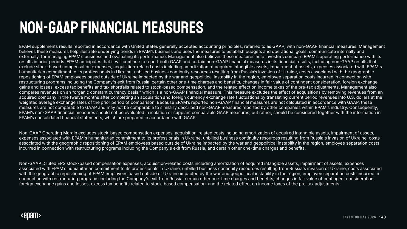 Non-GAAP Financial Measures EPAM supplements results reported in accordance with United States generally accepted accounting principles, referred to as GAAP, with non-GAAP financial measures. Management believes these measures help illustrate underlying trends in EPAM’s business and uses the measures to establish budgets and operational goals, communicate internally and externally, for managing EPAM’s business and evaluating its performance. Management also believes these measures help investors compare EPAM’s operating performance with its results in prior periods. EPAM anticipates that it will continue to report both GAAP and certain non-GAAP financial measures in its financial results, including non-GAAP results that exclude stock-based compensation expenses, acquisition-related costs including amortization of acquired intangible assets, impairment of assets, expenses associated with EPAM's humanitarian commitment to its professionals in Ukraine, unbilled business continuity resources resulting from Russia’s invasion of Ukraine, costs associated with the geographic repositioning of EPAM employees based outside of Ukraine impacted by the war and geopolitical instability in the region, employee separation costs incurred in connection with restructuring programs including the Company's exit from Russia, certain other one-time charges and benefits, changes in fair value of contingent consideration, foreign exchange gains and losses, excess tax benefits and tax shortfalls related to stock-based compensation, and the related effect on income taxes of the pre-tax adjustments. Management also compares revenues on an “organic constant currency basis,” which is a non-GAAP financial measure. This measure excludes the effect of acquisitions by removing revenues from an acquired company in the twelve months after completing an acquisition and foreign currency exchange rate fluctuations by translating current period revenues into U.S. dollars at the weighted average exchange rates of the prior period of comparison. Because EPAM’s reported non-GAAP financial measures are not calculated in accordance with GAAP, these measures are not comparable to GAAP and may not be comparable to similarly described non-GAAP measures reported by other companies within EPAM’s industry. Consequently, EPAM’s non-GAAP financial measures should not be evaluated in isolation or supplant comparable GAAP measures, but rather, should be considered together with the information in EPAM’s consolidated financial statements, which are prepared in accordance with GAAP. Non-GAAP Operating Margin excludes stock-based compensation expenses, acquisition-related costs including amortization of acquired intangible assets, impairment of assets, expenses associated with EPAM's humanitarian commitment to its professionals in Ukraine, unbilled business continuity resources resulting from Russia's invasion of Ukraine, costs associated with the geographic repositioning of EPAM employees based outside of Ukraine impacted by the war and geopolitical instability in the region, employee separation costs incurred in connection with restructuring programs including the Company's exit from Russia, and certain other one-time charges and benefits. Non-GAAP Diluted EPS stock-based compensation expenses, acquisition-related costs including amortization of acquired intangible assets, impairment of assets, expenses associated with EPAM’s humanitarian commitment to its professionals in Ukraine, unbilled business continuity resources resulting from Russia's invasion of Ukraine, costs associated with the geographic repositioning of EPAM employees based outside of Ukraine impacted by the war and geopolitical instability in the region, employee separation costs incurred in connection with restructuring programs including the Company's exit from Russia, certain other one-time charges and benefits, changes in fair value of contingent consideration, foreign exchange gains and losses, excess tax benefits related to stock-based compensation, and the related effect on income taxes of the pre-tax adjustments. 140