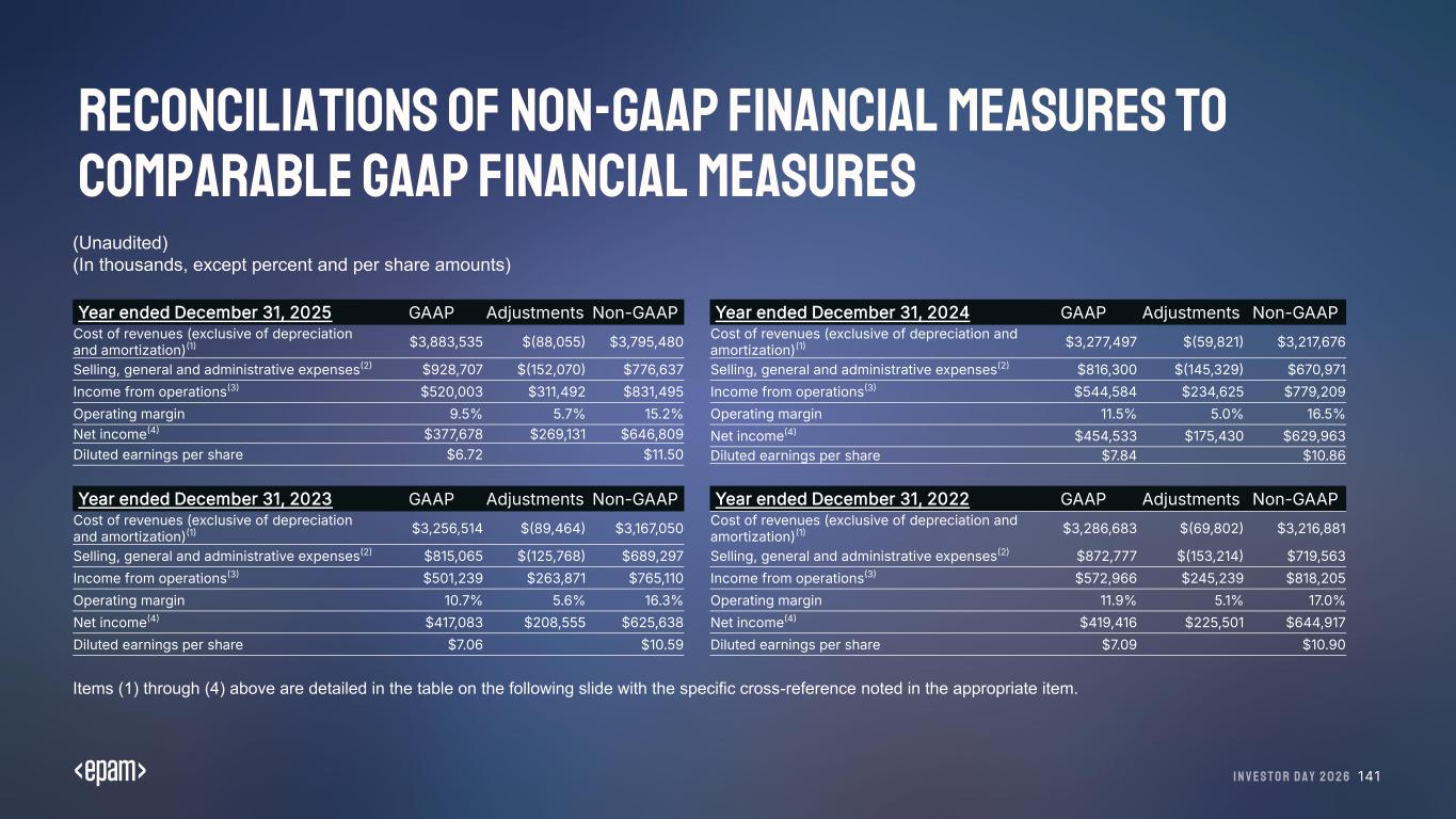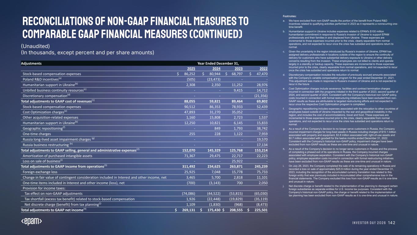 142 Reconciliations of Non-GAAP Financial Measures to Comparable GAAP Financial Measures (continued) (Unaudited) (In thousands, except percent and per share amounts) Adjustments Year Ended December 31, 2025 2024 2023 2022 Stock-based compensation expenses $ 86,252 $ 80,944 $ 68,797 $ 47,470 Poland R&D incentives(a) (505) (23,473) - - Humanitarian support in Ukraine(b) 2,308 2,350 11,252 28,976 Unbilled business continuity resources(c) - - 9,415 14,712 Discretionary compensation(d) - - - (21,356) Total adjustments to GAAP cost of revenues(1) 88,055 59,821 89,464 69,802 Stock-based compensation expenses 90,512 86,353 78,933 52,439 Cost Optimization charges(e) 47,893 31,270 35,052 - Other acquisition-related expenses 1,160 15,808 2,723 1,537 Humanitarian support in Ukraine(b) 12,250 10,821 6,145 15,833 Geographic repositioning(f) - 849 1,793 38,742 One-time charges 255 228 1,122 7,959 Russia long-lived asset impairment charges (g) - - - 19,570 Russia business restructuring (h) - - - 17,134 Total adjustments to GAAP selling, general and administrative expenses(2) 152,070 145,329 125,768 153,214 Amortization of purchased intangible assets 71,367 29,475 22,717 22,223 Loss on sale of business(i) - - 25,922 - Total adjustments to GAAP income from operations(3) 311,492 234,625 263,871 245,239 Foreign exchange loss 25,925 7,048 15,778 75,733 Change in fair value of contingent consideration included in Interest and other income, net 3,465 5,700 2,818 11,101 One-time items included in Interest and other income (loss), net (700) (3,143) 700 2,050 Provision for income taxes: Tax effect on non-GAAP adjustments (74,086) (44,522) (53,815) (65,030) Tax shortfall (excess tax benefit) related to stock-based compensation 1,926 (22,448) (19,829) (35,119) Net discrete charge (benefit) from tax planning(j) 1,109 (1,830) (968) (8,473) Total adjustments to GAAP net income(4) $ 269,131 $ 175,430 $ 208,555 $ 225,501 Footnotes: a. We have excluded from non-GAAP results the portion of the benefit from Poland R&D incentives related to qualifying activities performed in 2023 as it represents a nonrecurring one- time benefit. b. Humanitarian support in Ukraine includes expenses related to EPAM's $100 million humanitarian commitment in response to Russia's invasion of Ukraine to support EPAM professionals and their families in and displaced from Ukraine. These expenses are incremental to those expenses incurred prior to the crisis, clearly separable from normal operations, and not expected to recur once the crisis has subsided and operations return to normal. c. Given the uncertainty in the region introduced by Russia’s invasion of Ukraine, EPAM has assigned delivery professionals in locations outside of the region to ensure the continuity of delivery for customers who have substantial delivery exposure to Ukraine or other delivery concerns resulting from the invasion. These employees are not billed to clients and operate largely in a standby or backup capacity. These expenses are incremental to those expenses incurred prior to the crisis, clearly separable from normal operations, and not expected to recur once the crisis has subsided and operations return to normal. d. Discretionary compensation includes the reduction of previously accrued amounts associated with the Company's variable compensation program for the year ended December 31, 2021. This adjustment was made in response to Russia's invasion of Ukraine and is not expected to recur in the future e. Cost Optimization charges include severance, facilities and contract termination charges incurred in connection with the programs initiated in the third quarter of 2023, second quarter of 2024, and second quarter of 2025. Consistent with the Company's historical non-GAAP policy, costs incurred in connection with formal restructuring initiatives have been excluded from non- GAAP results as these are attributable to targeted restructuring efforts and not expected to recur once the respective Cost Optimization program is completed. f. Geographic repositioning includes expenses associated with the relocation to other countries of employees based outside of Ukraine impacted by the war and geopolitical instability in the region, and includes the cost of accommodations, travel and food. These expenses are incremental to those expenses incurred prior to the crisis, clearly separable from normal operations, and not expected to recur once the crisis has subsided and operations return to normal. g. As a result of the Company's decision to no longer serve customers in Russia, the Company incurred impairment charges for long-lived assets in Russia including charges of $15.1 million associated with property and equipment, $3.8 million associated with right-of-use assets and $0.7 million associated with goodwill for the twelve months ended December 31, 2022. Consistent with the Company's historical non-GAAP policy, impairment charges have been excluded from non-GAAP results as these are one-time and unusual in nature. h. As a result of the Company's decision to no longer serve customers in Russia and the process of completing a phased exit of its operations in Russia, the Company incurred charges associated with employee separation. Consistent with the Company's historical non-GAAP policy, employee separation costs incurred in connection with formal restructuring initiatives have been excluded from non-GAAP results as these are one-time and unusual in nature. i. On July 26, 2023, the Company completed the sale of its remaining operations in Russia and recorded a loss on sale of approximately $25.9 million during the year ended December 31, 2023, including the recognition of the accumulated currency translation loss related to this foreign entity that was previously included in Accumulated other comprehensive loss in the financial statements. The Company excluded this loss from non-GAAP results as it is one-time and unusual in nature. j. Net discrete charge or benefit related to th