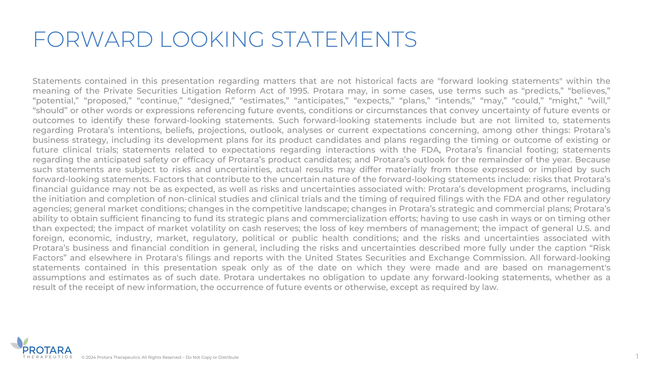 FORWARD LOOKING STATEMENTS Statements contained in this presentation regarding matters that are not historical facts are "forward looking statements" within the meaning of the Private Securities Litigation Reform Act of 1995 . Protara may, in some cases, use terms such as “predicts,” “believes,” “potential,” “proposed,” “continue,” “designed,” “estimates,” “anticipates,” “expects,” “plans,” “intends,” “may,” “could,” “might,” “will,” “should” or other words or expressions referencing future events, conditions or circumstances that convey uncertainty of future events or outcomes to identify these forward - looking statements . Although Protara believes that it has a reasonable basis for each forward - looking statement contained in this presentation, Protara cautions you that forward - looking statements are not guarantees of future performance and that its actual results of operations, financial condition and liquidity, and the development of the industry in which Protara operates may differ materially from the forward - looking statements contained in this presentation . Such forward - looking statements include but are not limited to, statements regarding Protara’s intentions, beliefs, projections, outlook, analyses or current expectations concerning, among other things : Protara’s business strategy, including its development plans for its product candidates and plans regarding the timing or outcome of existing or future clinical trials ; statements related to expectations regarding interactions with the U . S . Food and Drug Administration (FDA) , Protara’s financial footing ; statements regarding the anticipated safety or efficacy of Protara’s product candidates ; and Protara’s outlook for the remainder of the year . Because such statements are subject to risks and uncertainties, actual results may differ materially from those expressed or implied by such forward - looking statements . Factors that contribute to the uncertain nature of the forward - looking statements include : risks that Protara’s financial guidance may not be as expected, as well as risks and uncertainties associated with : Protara’s development programs, including the initiation and completion of non - clinical studies and clinical trials and the timing of required filings with the FDA and other regulatory agencies ; general market conditions ; changes in the competitive landscape ; changes in Protara’s strategic and commercial plans ; Protara’s ability to obtain sufficient financing to fund its strategic plans and commercialization efforts ; having to use cash in ways or on timing other than expected ; the impact of market volatility on cash reserves ; the loss of key members of management ; the impact of general U . S . and foreign, economic, industry, market, regulatory, political or public health conditions ; and the risks and uncertainties associated with Protara’s business and financial condition in general, including the risks and uncertainties described more fully under the caption “Risk Factors” and elsewhere in Protara's filings and reports with the United States Securities and Exchange Commission . All forward - looking statements contained in this presentation speak only as of the date on which they were made and are based on management's assumptions and estimates as of such date . Protara undertakes no obligation to update any forward - looking statements, whether as a result of the receipt of new information, the occurrence of future events or otherwise, except as required by law . This presentation shall not constitute an offer to sell or the solicitation of an offer to buy any securities, nor shall there be any sale of any securities in any state or jurisdiction in which such offer, solicitation or sale would be unlawful prior to registration or qualification under the securities laws of any such state or jurisdiction . The information provided in this presentation is strictly confidential . You must keep any information we provide to you at this meeting confidential unless and until we make such information public . 2 CONFIDENTIAL ©2024 Protara Therapeutics. All Rights Reserved – Do Not Copy or Distribute