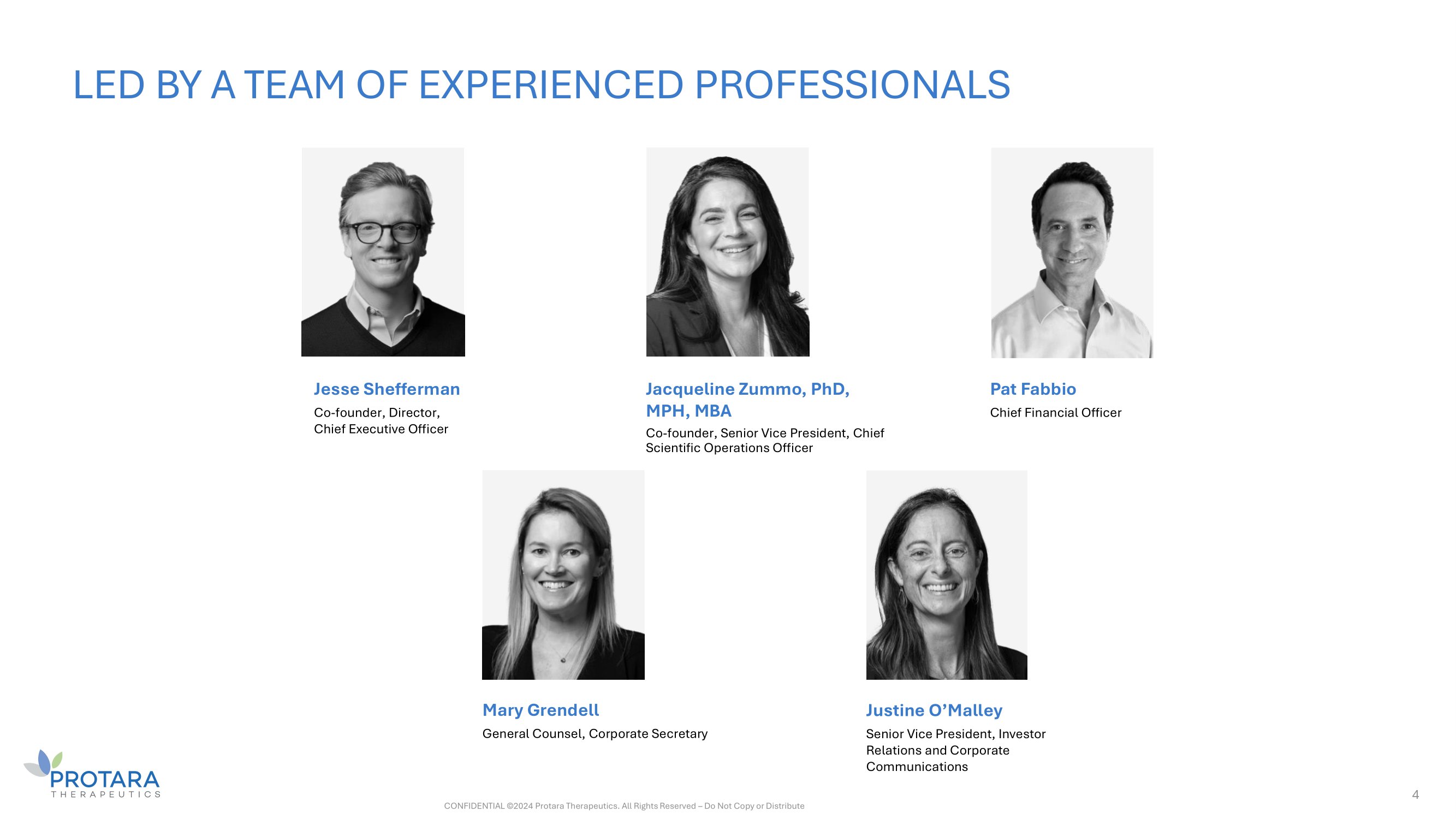 LED BY A TEAM OF EXPERIENCED PROFESSIONALS 4 Jesse Shefferman Co - founder, Director, Chief Executive Officer Pat Fabbio Chief Financial Officer Jacqueline Zummo, PhD, MPH, MBA Co - founder, Senior Vice President, Chief Scientific Operations Officer Justine O’Malley Senior Vice President, Investor Relations and Corporate Communications Mary Grendell General Counsel, Corporate Secretary CONFIDENTIAL ©2024 Protara Therapeutics. All Rights Reserved – Do Not Copy or Distribute