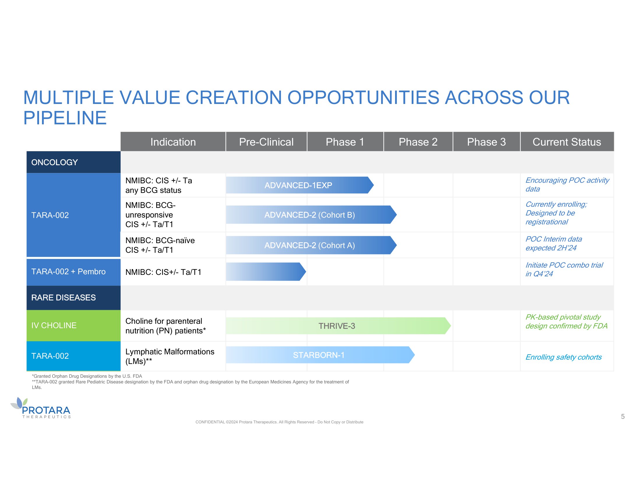 ENCOURAGING INTERIM NMIBC DATA; DE - RISKED RARE DISEASE PROGRAMS © 2024 Protara Therapeutics. All Rights Reserved – Do Not Copy or Distribute 3 *Patient contribution across trials: ADVANCED - 1 Ph 1a = 3 patients; ADVANCED - 1 Ph 1b = 8 patients; ADVANCED - 12 Ph 2 naïve cohort = 5 patients Data cut off date: 3/19/24 Definitions: CRR= Complete response rate, BCG = Bacillus Calmette - Guérin; NMIBC = non - muscle invasive bladder cancer; MOA = mechanism of action; CIS = Carcinoma in situ; PK/PD=Pharmacokinetic/pharmacodynamic; PN=parenteral nutrition; LMs=lymphatic malformations; PRV=pediatric review voucher TARA - 002 in NMIBC IV Choline Chloride in Parenteral Nutrition • Aligned with FDA on single pivotal study showing restoration of choline levels (already demonstrated in phase 2) • 40K addressable patient population, ODD and compound patent in U.S. (2041 exp.) • Planning to initiate pivotal study by YE’24 TARA - 002 in LMs • De - risked rare disease program with PRV opportunity • Ph 2 trial ongoing • Encouraging , pooled* 3 - month interim data in 16 CIS patients • Expecting enhanced CR Rates – MOA and non - clinical study suggest enhanced, durable CRs following continued dosing – Planned reinduction, priming and exploring higher dose – Planned anti - PD - 1 combo POC study • Unique characteristics anticipated to drive significant adoption