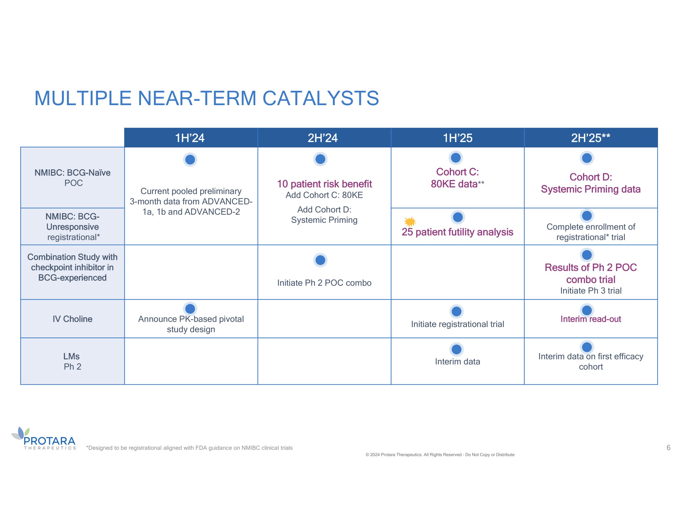 MULTIPLE VALUE CREATION OPPORTUNITIES ACROSS OUR PIPELINE 5 *Granted Orphan Drug Designations by the U.S. FDA **TARA - 002 granted Rare Pediatric Disease designation by the FDA and orphan drug designation by the European Medicines Agency for the treatment of LMs. Definitions: CPI=Checkpoint inhibitor CONFIDENTIAL ©2024 Protara Therapeutics. All Rights Reserved – Do Not Copy or Distribute Current Status Phase 3 Phase 2 Phase 1 Pre - Clinical Indication ONCOLOGY Encouraging POC activity data - 1EXP ADVANCED NMIBC: CIS +/ - Ta any BCG status TARA - 002 Currently enrolling; Designed to be registrational - 2 (Cohort B) ADVANCED NMIBC: BCG - unresponsive CIS +/ - Ta/T1 POC Interim data expected 2H’24 - 2 (Cohort A) ADVANCED NMIBC: BCG - naïve CIS +/ - Ta/T1 Initiate POC combo trial in Q4’24 NMIBC: CIS+/ - Ta/T1 TARA - 002 + Pembro RARE DISEASES PK - based pivotal study design confirmed by FDA THRIVE - 3 Choline for parenteral nutrition (PN) patients* IV CHOLINE Enrolling safety cohorts BORN - 1 STAR Lymphatic Malformations (LMs)** TARA - 002