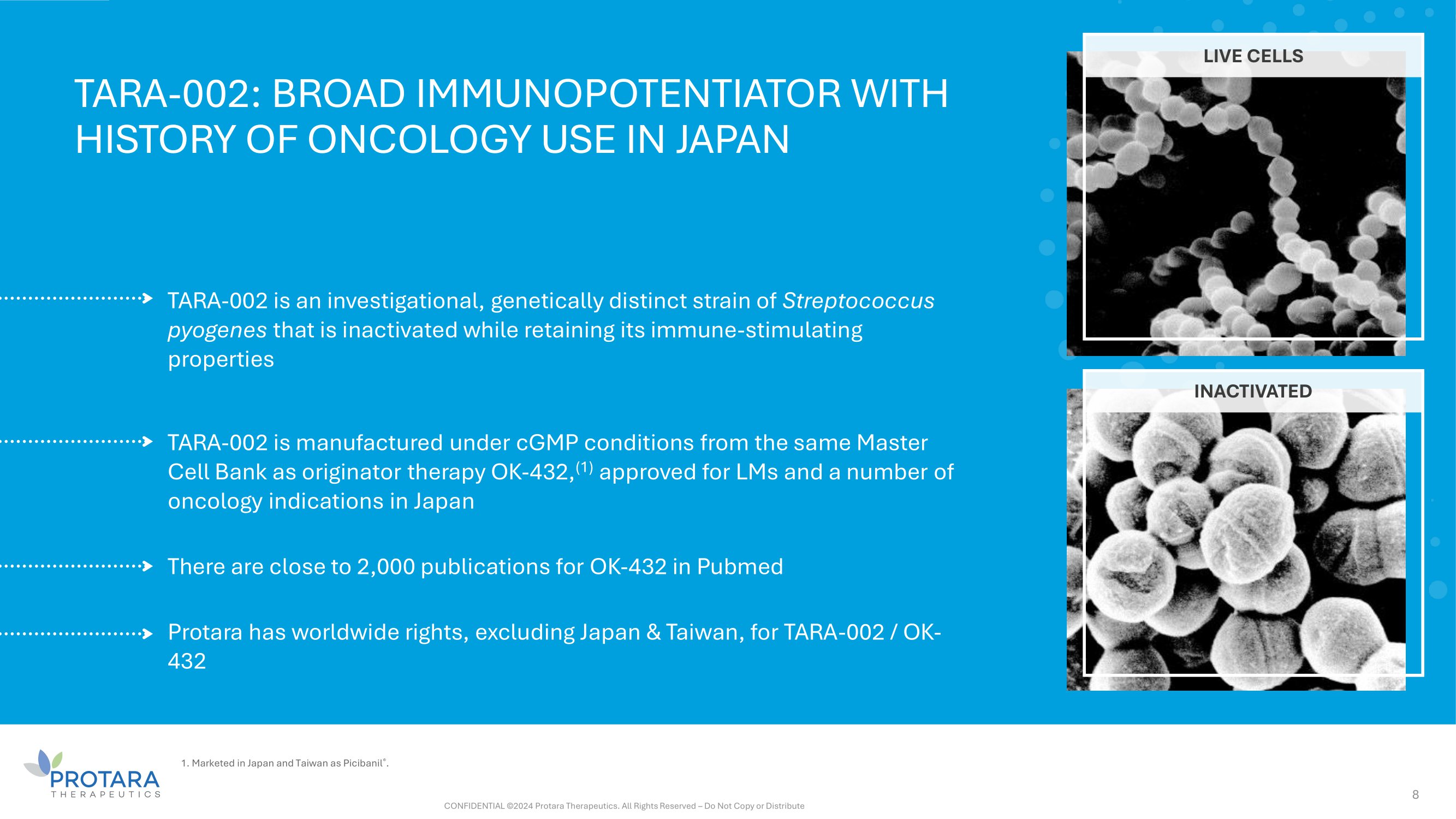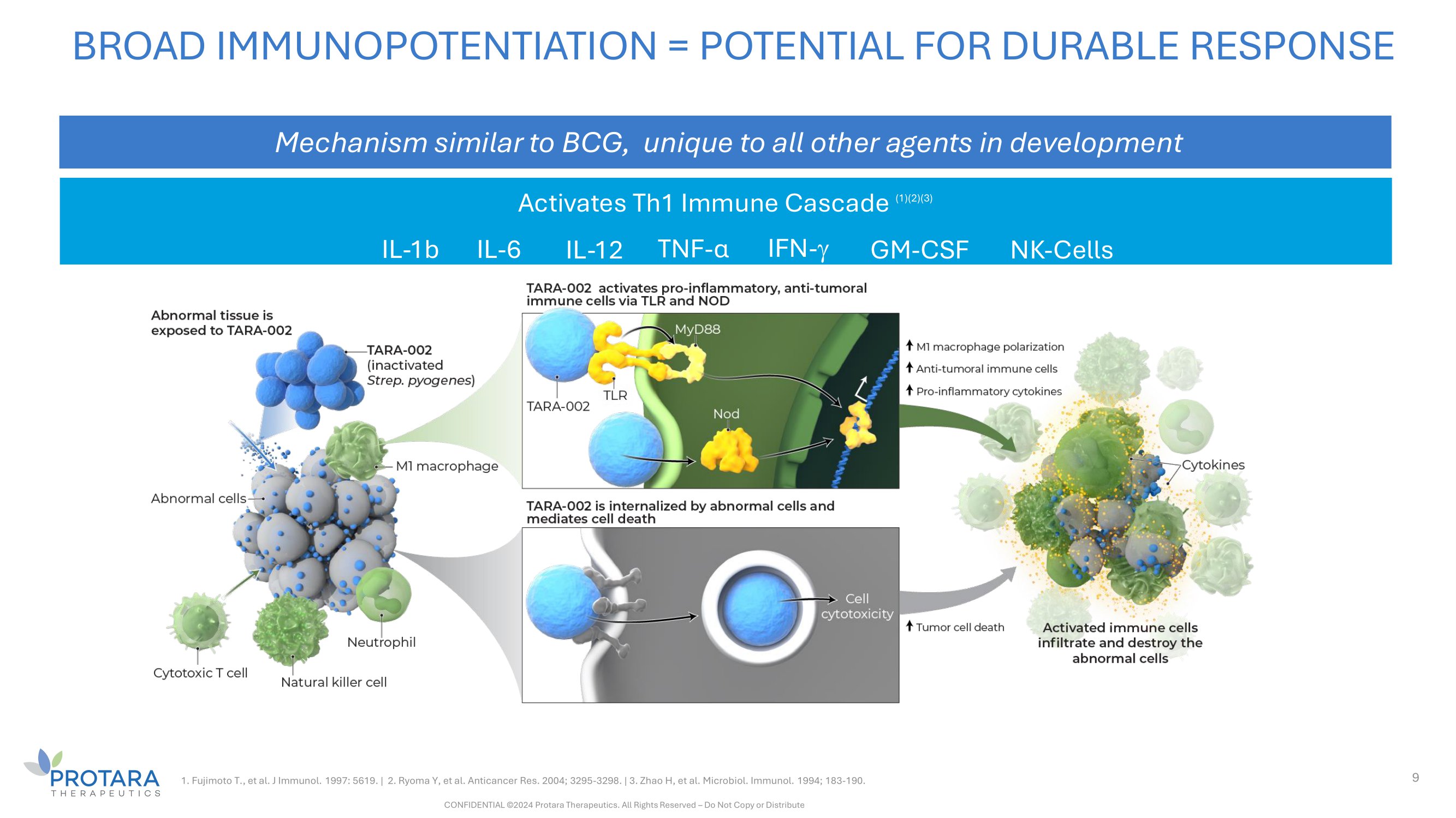 8 TARA - 002: BROAD IMMUNOPOTENTIATOR WITH HISTORY OF ONCOLOGY USE IN JAPAN TARA - 002 is an investigational, genetically distinct strain of Streptococcus pyogenes that is inactivated while retaining its immune - stimulating properties TARA - 002 is manufactured under cGMP conditions from the same Master Cell Bank as originator therapy OK - 432, (1) approved for LMs and a number of oncology indications in Japan There are close to 2,000 publications for OK - 432 in Pubmed Protara has worldwide rights, excluding Japan & Taiwan, for TARA - 002 / OK - 432 1. Marketed in Japan and Taiwan as Picibanil ® . LIVE CELLS INACTIVATED CONFIDENTIAL ©2024 Protara Therapeutics. All Rights Reserved – Do Not Copy or Distribute