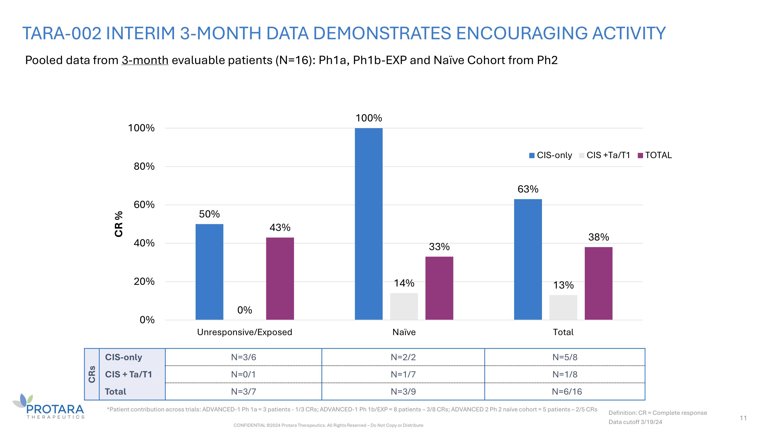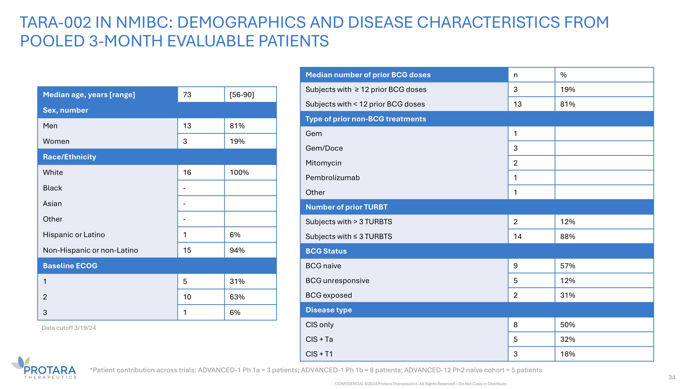 34 [56 - 90] 73 Median age, years [range] Sex, number 81% 13 Men 19% 3 Women Race/Ethnicity 100% 16 White - Black - Asian - Other 6% 1 Hispanic or Latino 94% 15 Non - Hispanic or non - Latino Baseline ECOG 31% 5 1 63% 10 2 6% 1 3 TARA - 002 IN NMIBC: DEMOGRAPHICS AND DISEASE CHARACTERISTICS FROM POOLED 3 - MONTH EVALUABLE PATIENTS % n Median number of prior BCG doses 19% 3 Subjects with ≥ 12 prior BCG doses 81% 13 Subjects with < 12 prior BCG doses Type of prior non - BCG treatments 1 Gem 3 Gem/Doce 2 Mitomycin 1 Pembrolizumab 1 Other Number of prior TURBT 12% 2 Subjects with > 3 TURBTS 88% 14 Subjects with ≤ 3 TURBTS BCG Status 57% 9 BCG naïve 12% 5 BCG unresponsive 31% 2 BCG exposed Disease type 50% 8 CIS only 32% 5 CIS + Ta 18% 3 CIS + T1 Data cutoff 3/19/24 *Patient contribution across trials: ADVANCED - 1 Ph 1a = 3 patients; ADVANCED - 1 Ph 1b = 8 patients; ADVANCED - 12 Ph2 naïve cohort = 5 patients CONFIDENTIAL ©2024 Protara Therapeutics. All Rights Reserved – Do Not Copy or Distribute