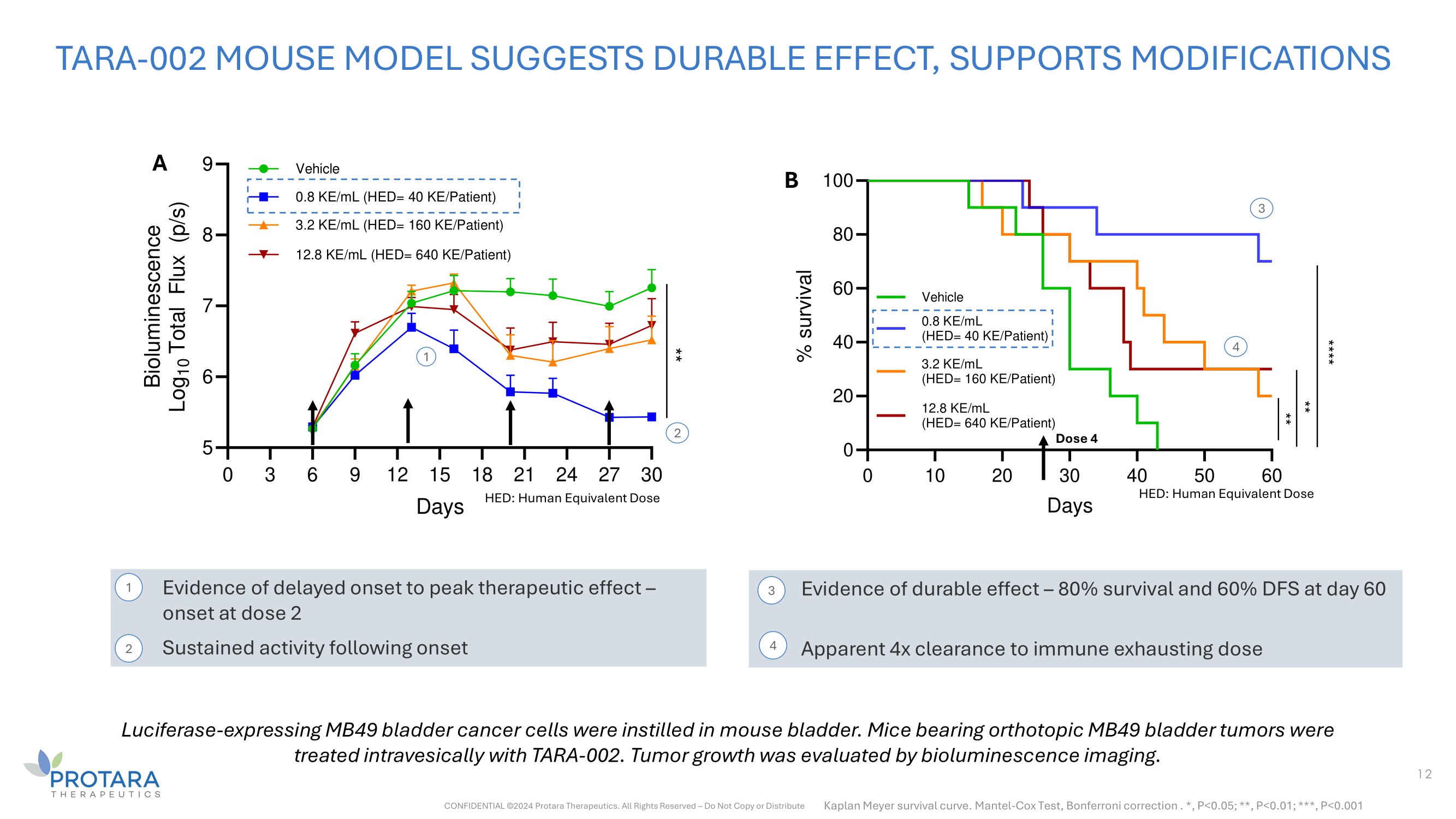 Apparent 4x clearance to immune exhausting dose TARA - 002 MOUSE MODEL SUGGESTS DURABLE EFFECT, SUPPORTS MODIFICATIONS Kaplan Meyer survival curve. Mantel - Cox Test, Bonferroni correction . *, P<0.05; **, P<0.01; ***, P<0.001 1 1 ) Evidence of delayed onset to peak therapeutic effect – onset at dose 2 2 2 ) Sustained activity following onset HED: Human Equivalent Dose Luciferase - expressing MB49 bladder cancer cells were instilled in mouse bladder. Mice bearing orthotopic MB49 bladder tumors were treated intravesically with TARA - 002. Tumor growth was evaluated by bioluminescence imaging. B 100 0 10 20 40 50 60 30 Days 0 20 40 60 80 % survival Vehicle 0.8 KE/mL (HED= 40 KE/Patient) 3.2 KE/mL (HED= 160 KE/Patient) 12.8 KE/mL (HED= 640 KE/Patient) Dose 4 **** ** ** 0 3 6 9 12 15 18 21 24 27 30 Days HED: Human Equivalent Dose 5 6 7 8 A 9 Bioluminescence Log 10 Total Flux (p/s) Vehicle 0.8 KE/mL (HED= 40 KE/Patient) 3.2 KE/mL (HED= 160 KE/Patient) 12.8 KE/mL (HED= 640 KE/Patient) ** 1 2 3 4 3 Evidence of durable effect – 80% survival and 60% DFS at day 60 4 12 CONFIDENTIAL ©2024 Protara Therapeutics. All Rights Reserved – Do Not Copy or Distribute