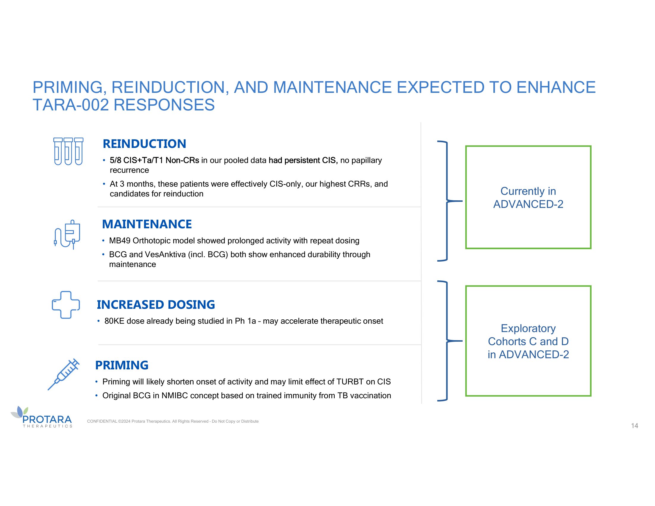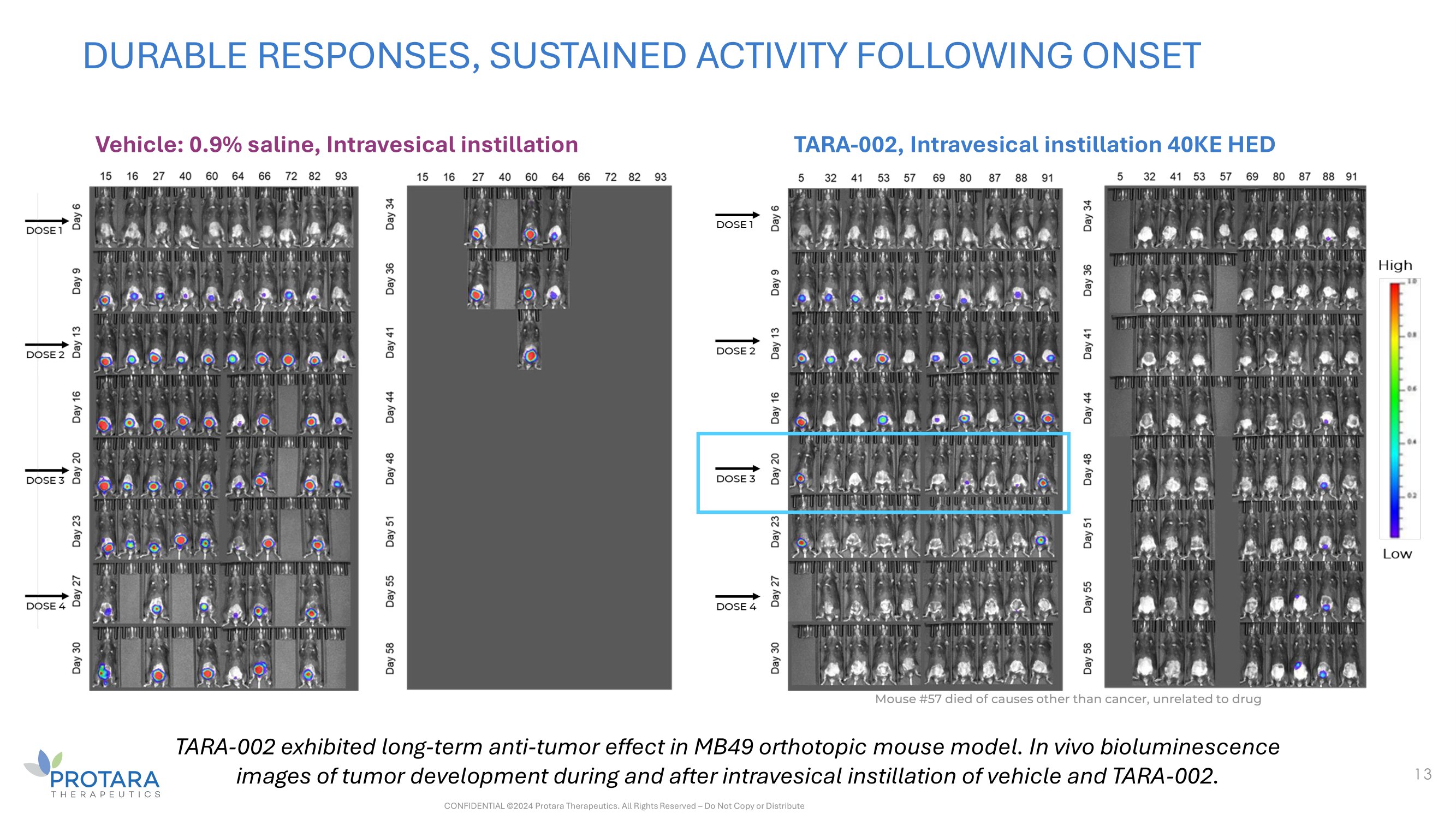 TARA - 002, Intravesical instillation 40KE HED Vehicle: 0.9% saline, Intravesical instillation DURABLE RESPONSES, SUSTAINED ACTIVITY FOLLOWING ONSET TARA - 002 exhibited long - term anti - tumor effect in MB49 orthotopic mouse model. In vivo bioluminescence images of tumor development during and after intravesical instillation of vehicle and TARA - 002. CONFIDENTIAL ©2024 Protara Therapeutics. All Rights Reserved – Do Not Copy or Distribute Mouse #57 died of causes other than cancer, unrelated to drug 13