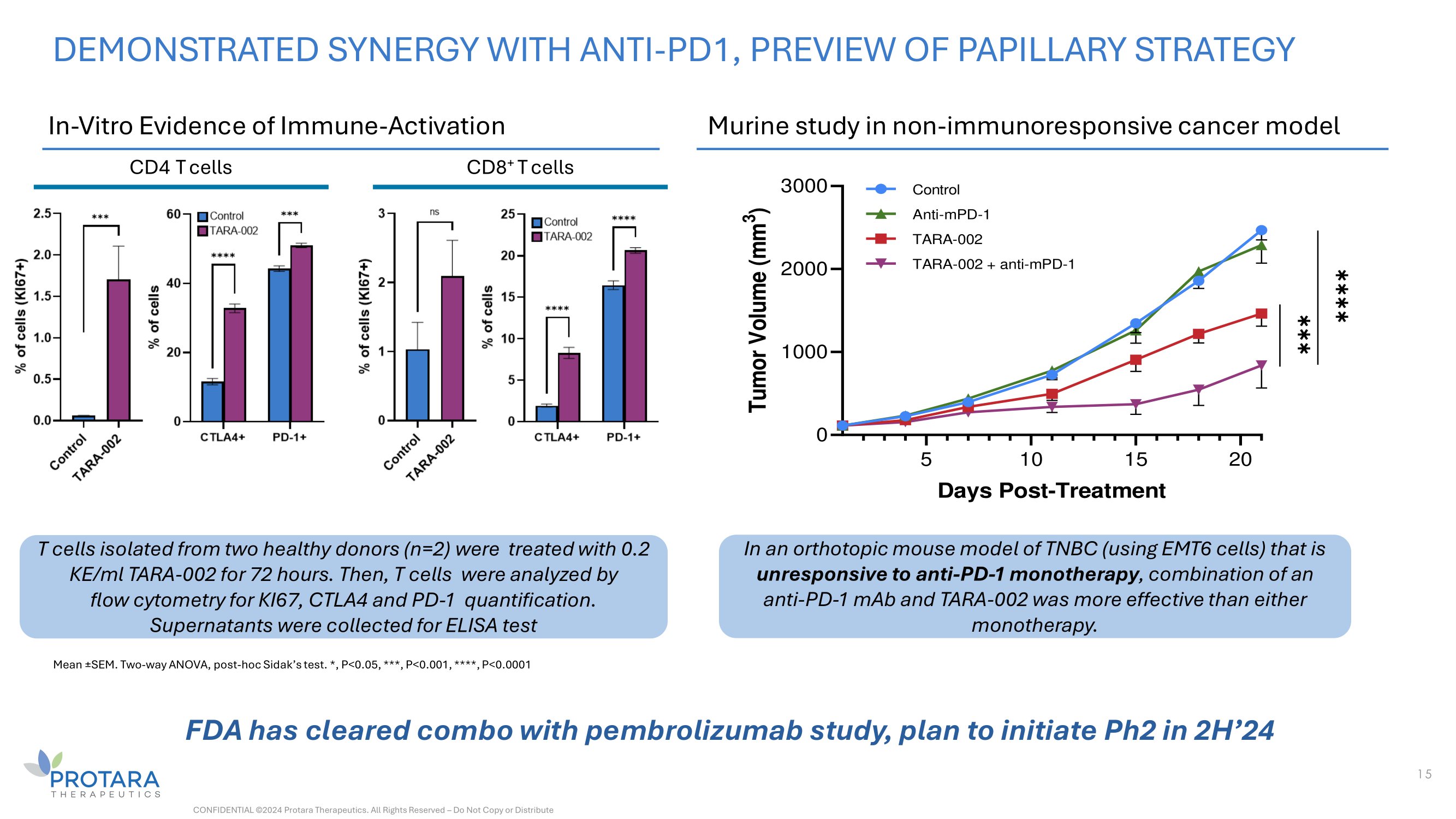 15 DEMONSTRATED SYNERGY WITH ANTI - PD1, PREVIEW OF PAPILLARY STRATEGY CONFIDENTIAL ©2024 Protara Therapeutics. All Rights Reserved – Do Not Copy or Distribute In - Vitro Evidence of Immune - Activation Murine study in non - immunoresponsive cancer model CD4 T cells CD8 + T cells T cells isolated from two healthy donors (n=2) were treated with 0.2 KE/ml TARA - 002 for 72 hours. Then, T cells were analyzed by flow cytometry for KI67, CTLA4 and PD - 1 quantification. Supernatants were collected for ELISA test Mean ц SEM. Two - way ANOVA, post - hoc Sidak’s test. *, P<0.05, ***, P<0.001, ****, P<0.0001 5 20 0 1000 2000 3000 10 15 Days Post - Treatment Tumor Volume (mm 3 ) ٓٓٓ ٓٓٓ ٓ Control Anti - mPD - 1 TARA - 002 TARA - 002 + anti - mPD - 1 In an orthotopic mouse model of TNBC (using EMT6 cells) that is unresponsive to anti - PD - 1 monotherapy , combination of an anti - PD - 1 mAb and TARA - 002 was more effective than either monotherapy. FDA has cleared combo with pembrolizumab study, plan to initiate Ph2 in 2H’24