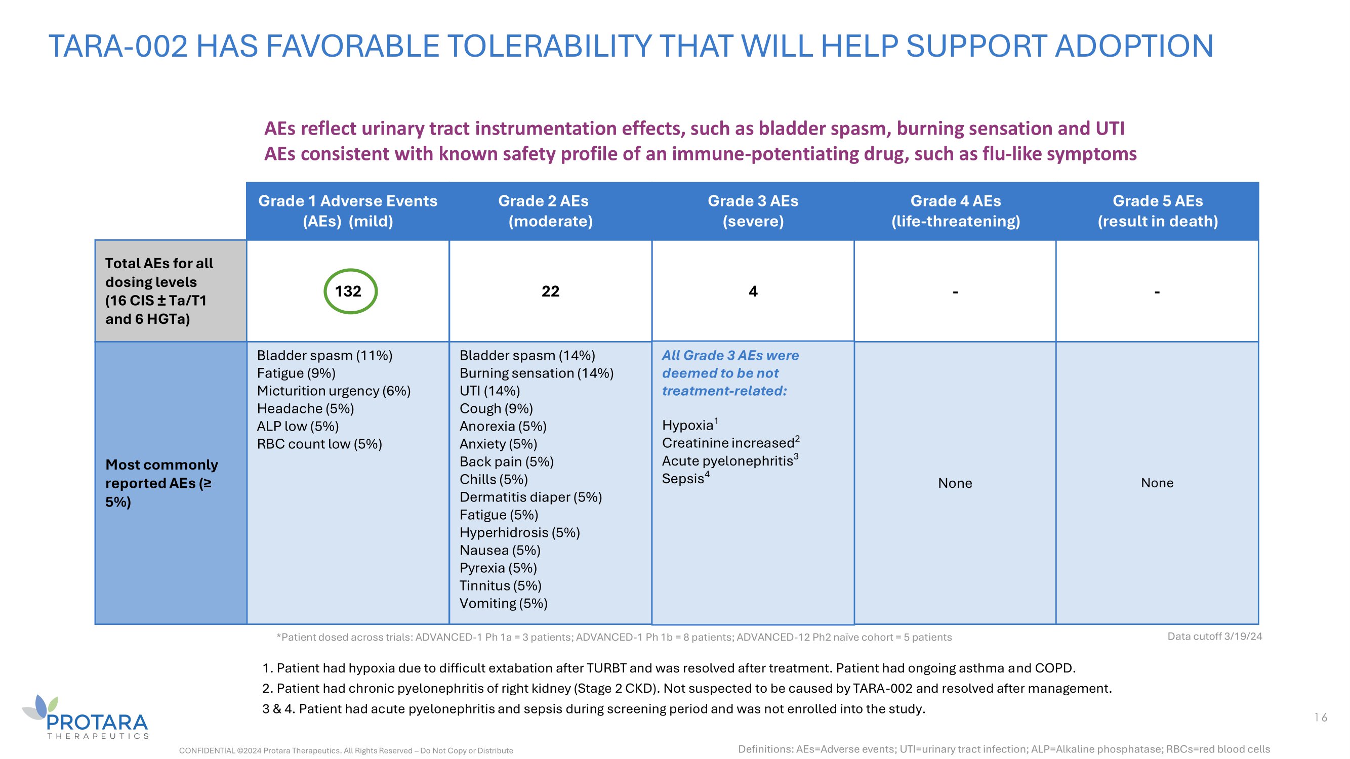 16 Grade 5 AEs (result in death) Grade 4 AEs (life - threatening) Grade 3 AEs (severe) Grade 2 AEs (moderate) Grade 1 Adverse Events (AEs) (mild) - - 4 22 132 Total AEs for all dosing levels (16 CIS “ Ta/T1 and 6 HGTa) None None All Grade 3 AEs were deemed to be not treatment - related: Hypoxia 1 Creatinine increased 2 Acute pyelonephritis 3 Sepsis 4 Bladder spasm (14%) Burning sensation (14%) UTI (14%) Cough (9%) Anorexia (5%) Anxiety (5%) Back pain (5%) Chills (5%) Dermatitis diaper (5%) Fatigue (5%) Hyperhidrosis (5%) Nausea (5%) Pyrexia (5%) Tinnitus (5%) Vomiting (5%) Bladder spasm (11%) Fatigue (9%) Micturition urgency (6%) Headache (5%) ALP low (5%) RBC count low (5%) Most commonly reported AEs (≥ 5%) AEs reflect urinary tract instrumentation effects, such as bladder spasm, burning sensation and UTI AEs consistent with known safety profile of an immune - potentiating drug, such as flu - like symptoms TARA - 002 HAS FAVORABLE TOLERABILITY THAT WILL HELP SUPPORT ADOPTION 1. Patient had hypoxia due to difficult extabation after TURBT and was resolved after treatment. Patient had ongoing asthma and COPD. 2. Patient had chronic pyelonephritis of right kidney (Stage 2 CKD). Not suspected to be caused by TARA - 002 and resolved after management. 3 & 4. Patient had acute pyelonephritis and sepsis during screening period and was not enrolled into the study. CONFIDENTIAL ©2024 Protara Therapeutics. All Rights Reserved – Do Not Copy or Distribute *Patient dosed across trials: ADVANCED - 1 Ph 1a = 3 patients; ADVANCED - 1 Ph 1b = 8 patients; ADVANCED - 12 Ph2 naïve cohort = 5 patients Data cutoff 3/19/24 Definitions: AEs=Adverse events; UTI=urinary tract infection; ALP=Alkaline phosphatase; RBCs=red blood cells