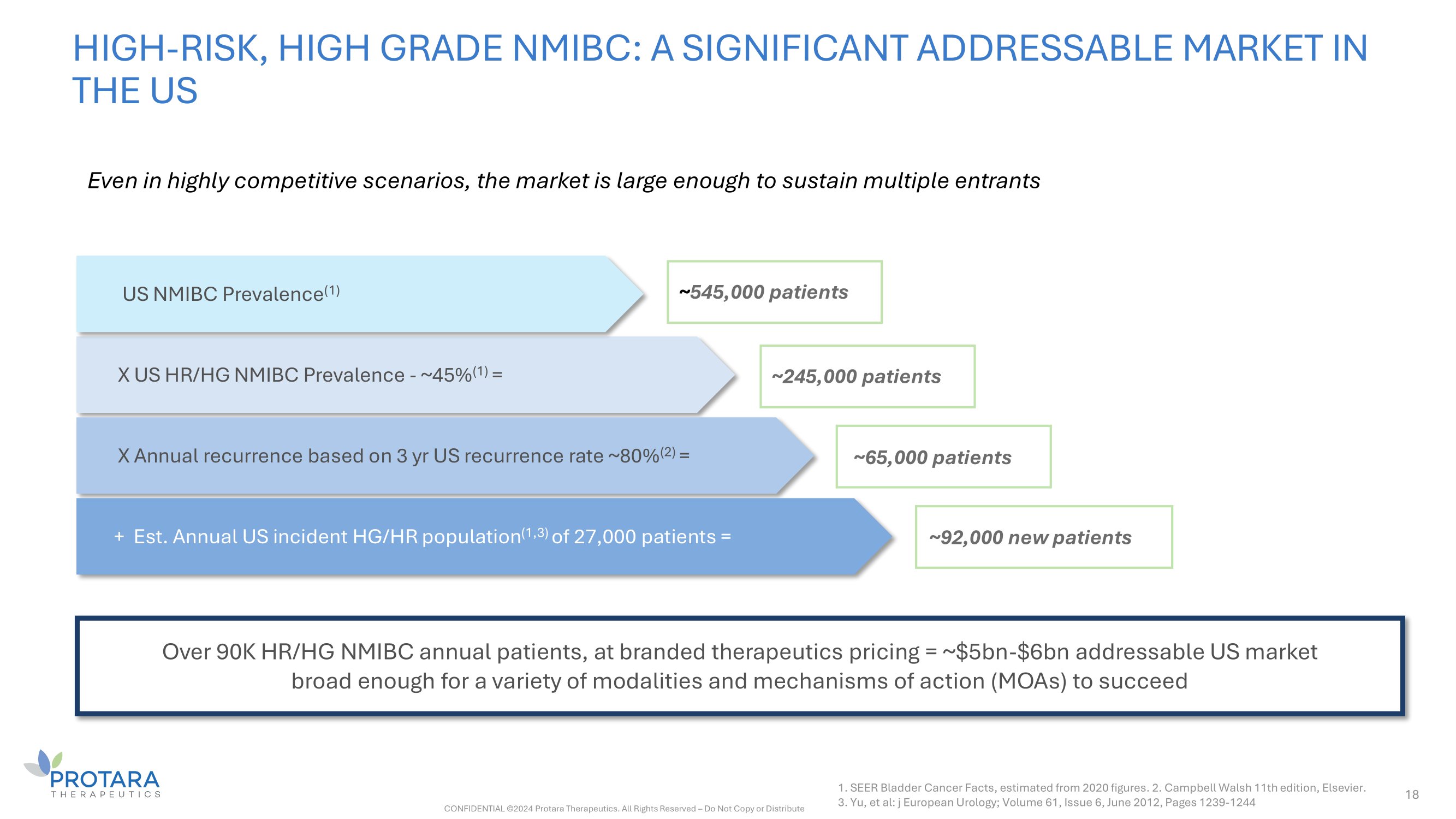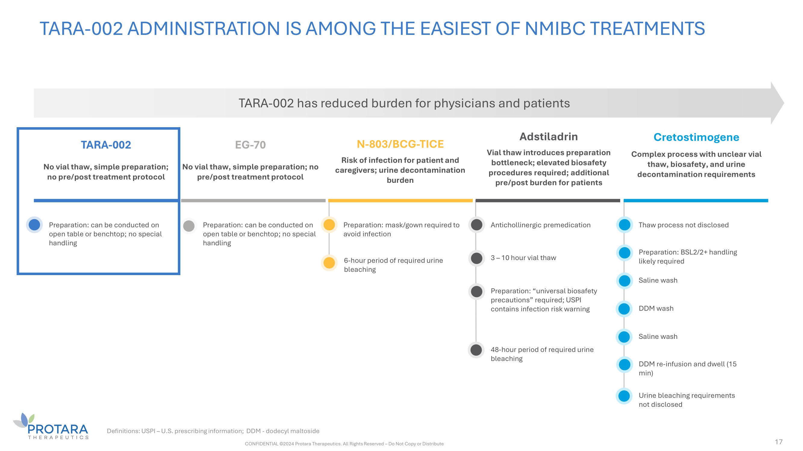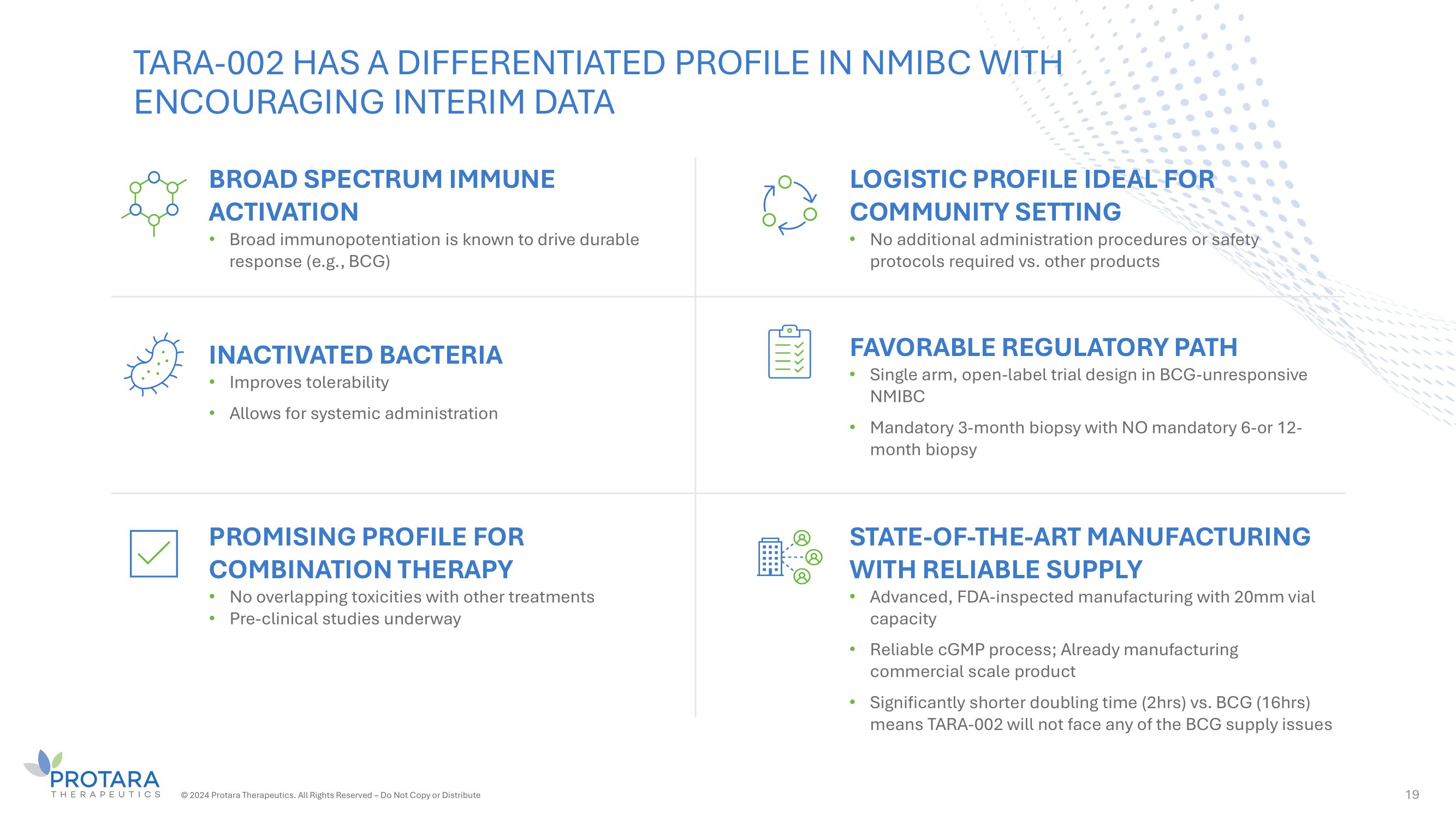 TARA - 002 ADMINISTRATION IS AMONG THE EASIEST OF NMIBC TREATMENTS 17 TARA - 002 No vial thaw, simple preparation; no pre/post treatment protocol EG - 70 No vial thaw, simple preparation; no pre/post treatment protocol N - 803/BCG - TICE Risk of infection for patient and caregivers; urine decontamination burden Adstiladrin Vial thaw introduces preparation bottleneck; elevated biosafety procedures required; additional pre/post burden for patients Cretostimogene Complex process with unclear vial thaw, biosafety, and urine decontamination requirements TARA - 002 has reduced burden for physicians and patients Preparation: can be conducted on open table or benchtop; no special handling Preparation: can be conducted on open table or benchtop; no special handling Preparation: mask/gown required to avoid infection 6 - hour period of required urine bleaching Antichollinergic premedication 3 – 10 hour vial thaw Preparation: “universal biosafety precautions” required; USPI contains infection risk warning 48 - hour period of required urine bleaching Thaw process not disclosed Preparation: BSL2/2+ handling likely required Saline wash DDM wash Saline wash DDM re - infusion and dwell (15 min) Urine bleaching requirements not disclosed Definitions: USPI – U.S. prescribing information; DDM - dodecyl maltoside CONFIDENTIAL ©2024 Protara Therapeutics. All Rights Reserved – Do Not Copy or Distribute