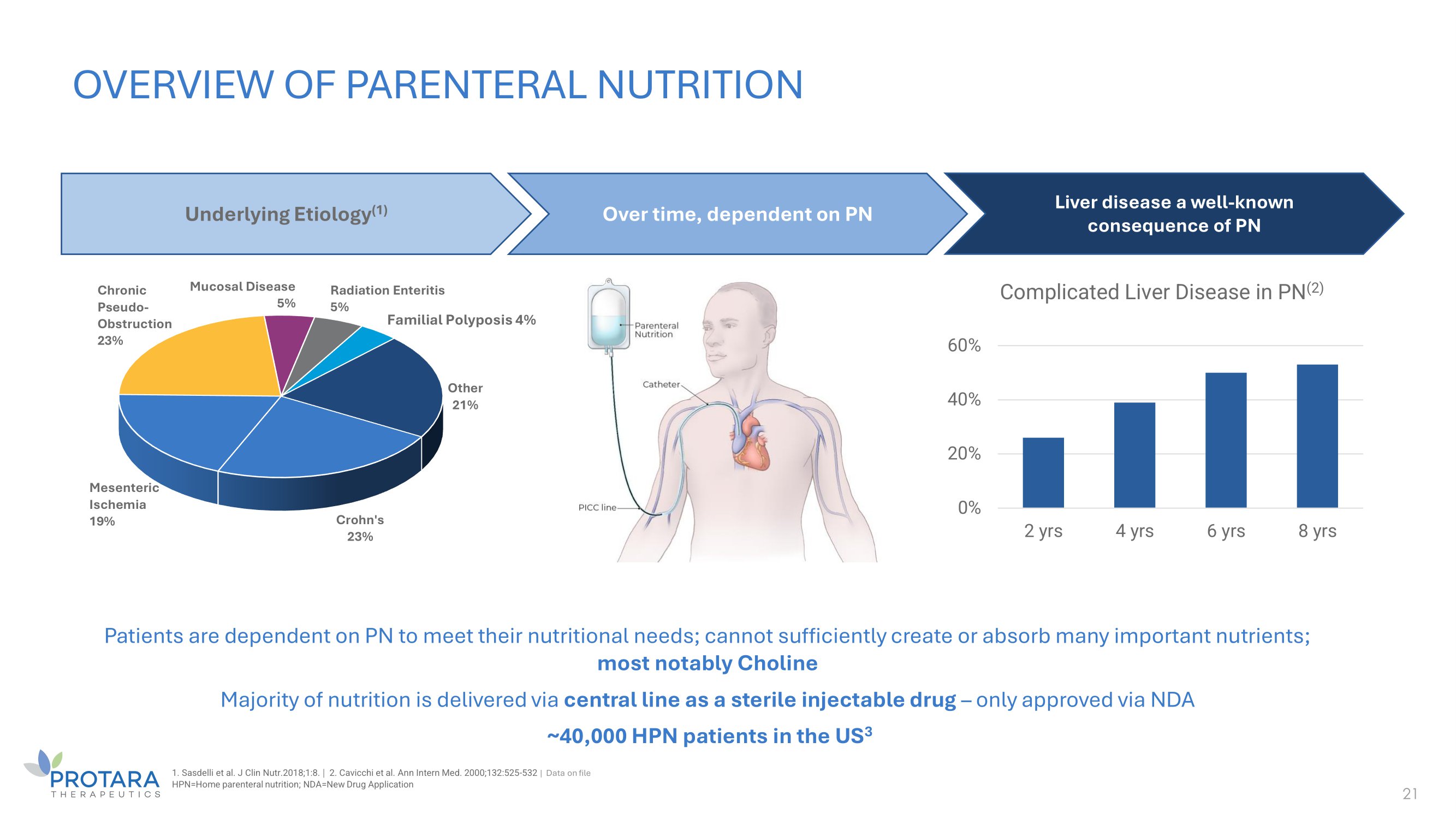 OVERVIEW OF PARENTERAL NUTRITION 21 Crohn's 23% Mesenteric Ischemia 19% Chronic Pseudo - Obstruction 23% Mucosal Disease 5% Radiation Enteritis 5% Familial Polyposis 4% Other 21% Underlying Etiology (1) Over time, dependent on PN Liver disease a well - known consequence of PN Patients are dependent on PN to meet their nutritional needs; cannot sufficiently create or absorb many important nutrients; most notably Choline Majority of nutrition is delivered via central line as a sterile injectable drug – only approved via NDA ~40,000 HPN patients in the US 3 1. Sasdelli et al. J Clin Nutr.2018;1:8. | 2. Cavicchi et al. Ann Intern Med. 2000;132:525 - 532 | Data on file HPN=Home parenteral nutrition; NDA=New Drug Application 0% 20% 40% 60% 2 yrs 4 yrs 6 yrs 8 yrs Complicated Liver Disease in PN (2)