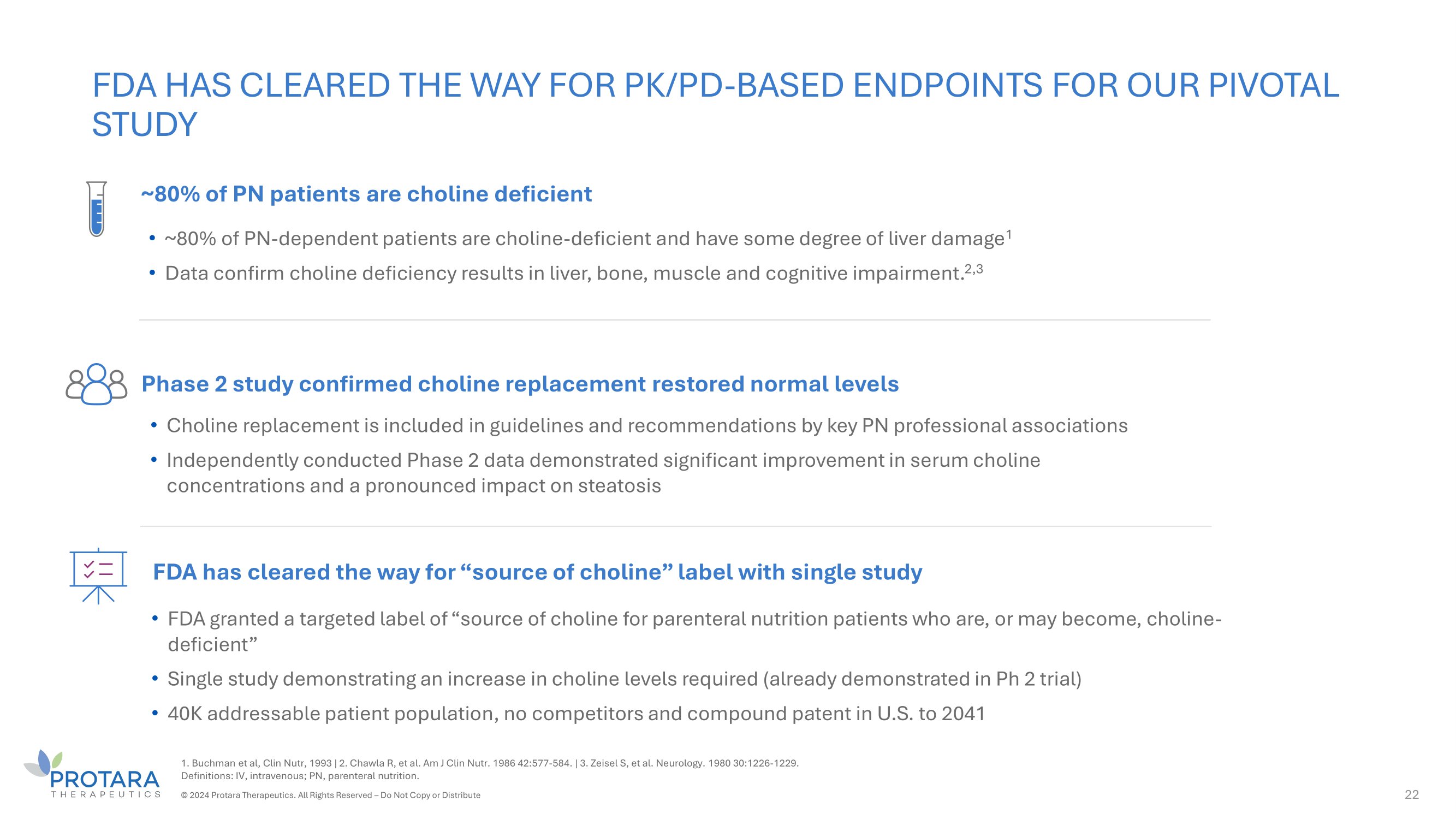 CHOLINE REPLACEMENT RECOMMENDED IN KEY PN GUIDELINES 25 Parenteral Nutrition Professional Societies’ Position on Choline Guidelines / Position Paper ASPEN 2012 Position Paper (Vanek et al.) 3 : • Includes recommendations for Multivitamins & Multi - Trace Element PN Products • Recognises the impact of long - term choline deficiency on the development of steatosis and hepatocellular carcinoma • Recommends that a commercially available parenteral choline product, either as an individual product or incorporated into a multivitamin product, should be developed and routinely added to adult PN formulas at a dose of 550 mg per day ESPEN Micronutrient Guideline 2022 (Berger et al.) 4 : • (Can/may) monitor choline in patients with abnormal liver function • (Can/may) consider treatment of HPN patients with abnormal liver function or proven deficiency with 550mg - 2g/day choline • (Can/may) prescribe a dose of 400 - 550 mg choline via EN or PN per day has been suggested to support lipid metabolism Sources: 1. ASPEN PN Guidelines 2. ESPEN Guideline 3. Vanek et al. 2012 . 4. Berger et al. 2022 . Abbreviations: IV = intravenous; (H)PN = (home) parenteral nutrition; EN = enteral nutrition. CONFIDENTIAL ©2024 Protara Therapeutics. All Rights Reserved – Do Not Copy or Distribute