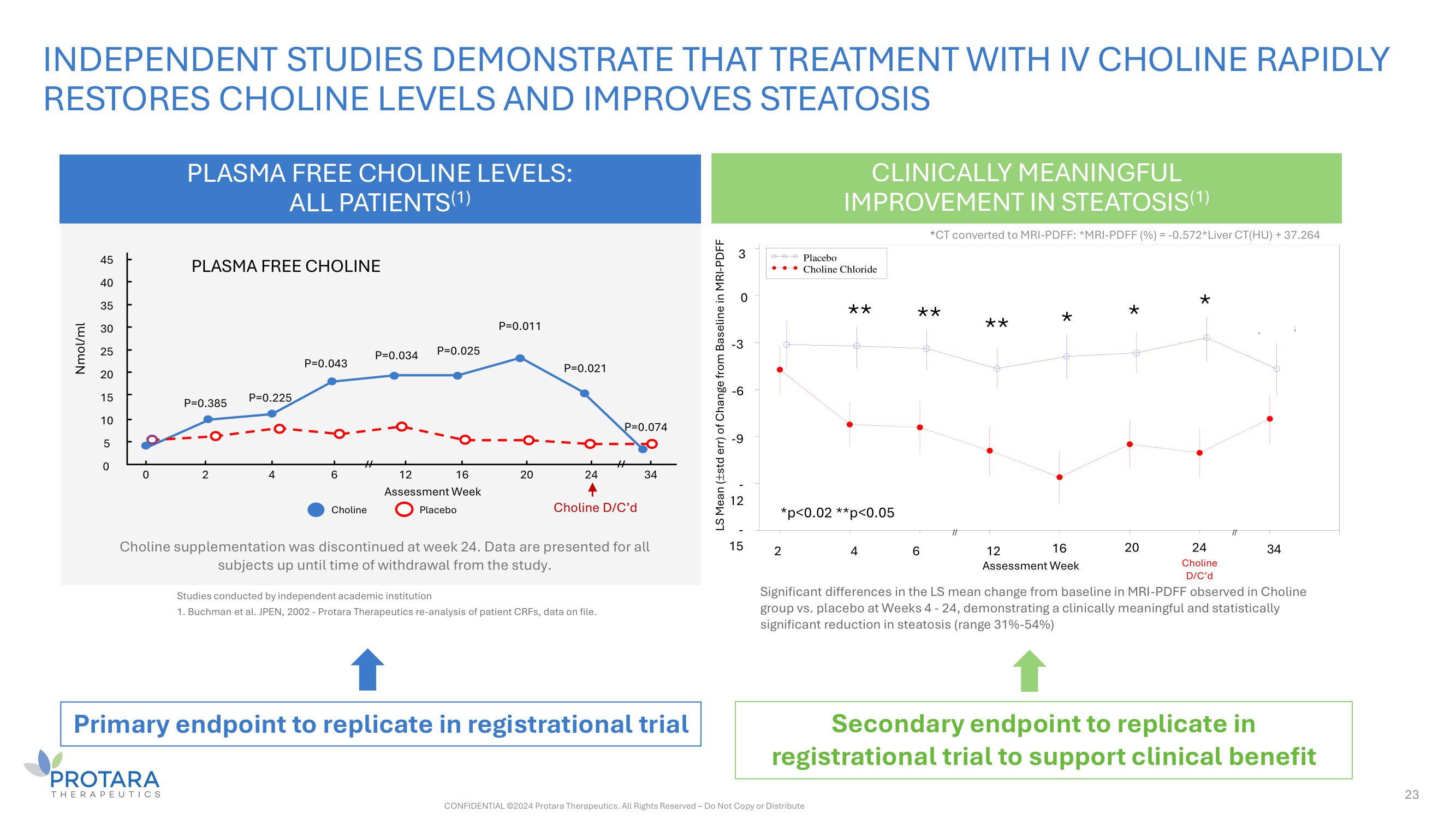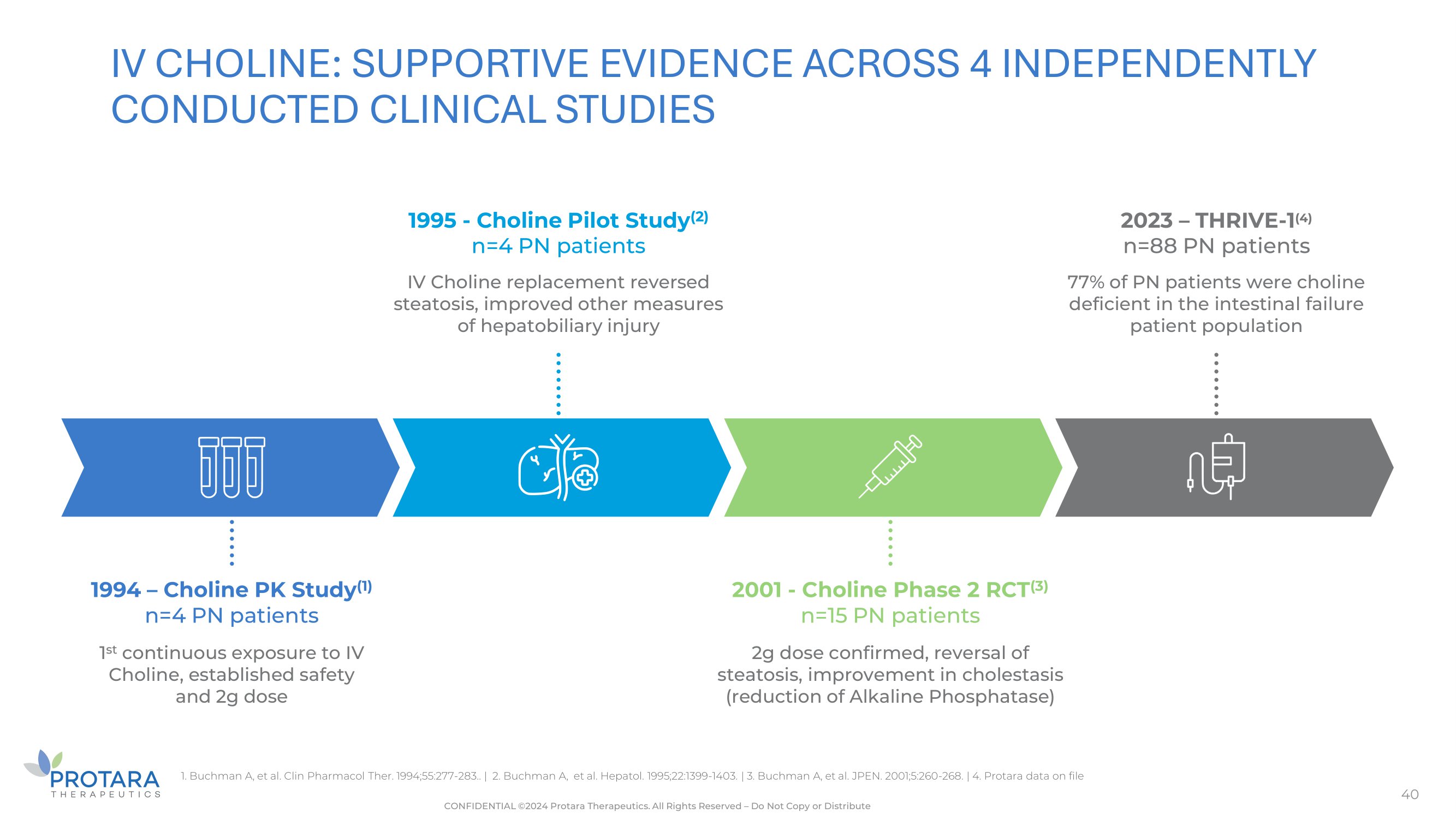 INDEPENDENT STUDIES DEMONSTRATE THAT TREATMENT WITH IV CHOLINE RAPIDLY RESTORES CHOLINE LEVELS AND IMPROVES STEATOSIS 23 CONFIDENTIAL ©2024 Protara Therapeutics. All Rights Reserved – Do Not Copy or Distribute PLASMA FREE CHOLINE LEVELS: ALL PATIENTS (1) Choline supplementation was discontinued at week 24. Data are presented for all subjects up until time of withdrawal from the study. PLASMA FREE CHOLINE Nmol/ml Choline D/C’d 0 2 4 6 20 24 34 P=0.225 P=0.043 P=0.034 P=0.025 P=0.011 P=0.021 P=0.074 45 40 35 30 25 20 15 10 5 0 Choline 12 16 Assessment Week Placebo // // CLINICALLY MEANINGFUL IMPROVEMENT IN STEATOSIS (1) P=0.385 Studies conducted by independent academic institution 1. Buchman et al. JPEN, 2002 - Protara Therapeutics re - analysis of patient CRFs, data on file. Choline D/C'd Assessment Week S Means tderr) ange f aseli L (+/ - s of ch rom B ne of MRI - p= 0.4770 p= 0.0197 p= 0.0312 p= 0.0180 p= 0.0014 p= 0.0091 p= 0.0021 p= 0.1823 // // - 15 - 12 - 9 - 6 - 3 0 3 2 4 6 12 16 20 24 34 Placebo Choline Chloride * * * ** ** ** - 3 3 0 - 6 - 9 - 2 1 - 15 Assessment Week *p<0.02 **p<0.05 2 4 6 12 16 20 Choline D/C’d 34 24 Significant differences in the LS mean change from baseline in MRI - PDFF observed in Choline group vs. placebo at Weeks 4 - 24, demonstrating a clinically meaningful and statistically significant reduction in steatosis (range 31% - 54%) * CT converted to MRI - PDFF: *MRI - PDFF (%) = - 0.572*Liver CT(HU) + 37.264 LS Mean ( std err) of Change from Baseline in M PD R F I - F PDFF Primary endpoint to replicate in registrational trial Secondary endpoint to replicate in registrational trial to support clinical benefit