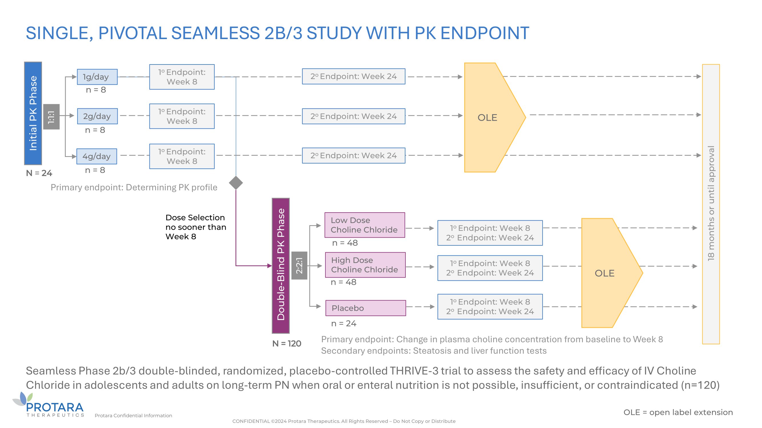 SINGLE, PIVOTAL SEAMLESS 2B/3 STUDY WITH PK ENDPOINT Protara Confidential Information OLE = open label extension Seamless Phase 2b/3 double - blinded, randomized, placebo - controlled THRIVE - 3 trial to assess the safety and efficacy of IV Choline Chloride in adolescents and adults on long - term PN when oral or enteral nutrition is not possible, insufficient, or contraindicated (n=120) Primary endpoint: Change in plasma choline concentration from baseline to Week 8 Secondary endpoints: Steatosis and liver function tests Initial PK Phase 18 months or until approval 1g/day 4g/day n = 8 n = 8 2g/day n = 8 OLE Dose Selection no sooner than Week 8 1:1:1 Double - Blind PK Phase Low Dose Choline Chloride High Dose Choline Chloride Placebo 1 o Endpoint: Week 8 2 o Endpoint: Week 24 OLE 2:2:1 n = 48 n = 48 n = 24 N = 120 N = 24 1 o Endpoint: Week 8 2 o Endpoint: Week 24 1 o Endpoint: Week 8 2 o Endpoint: Week 24 1 o Endpoint: Week 8 2 o Endpoint: Week 24 1 o Endpoint: Week 8 1 o Endpoint: Week 8 2 o Endpoint: Week 24 2 o Endpoint: Week 24 Primary endpoint: Determining PK profile CONFIDENTIAL ©2024 Protara Therapeutics. All Rights Reserved – Do Not Copy or Distribute