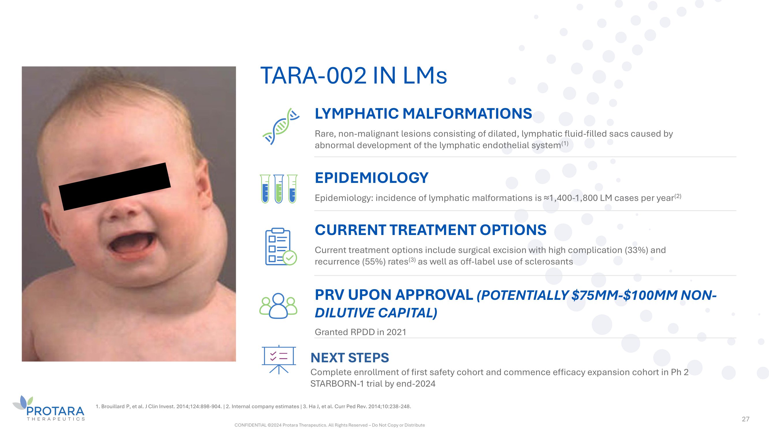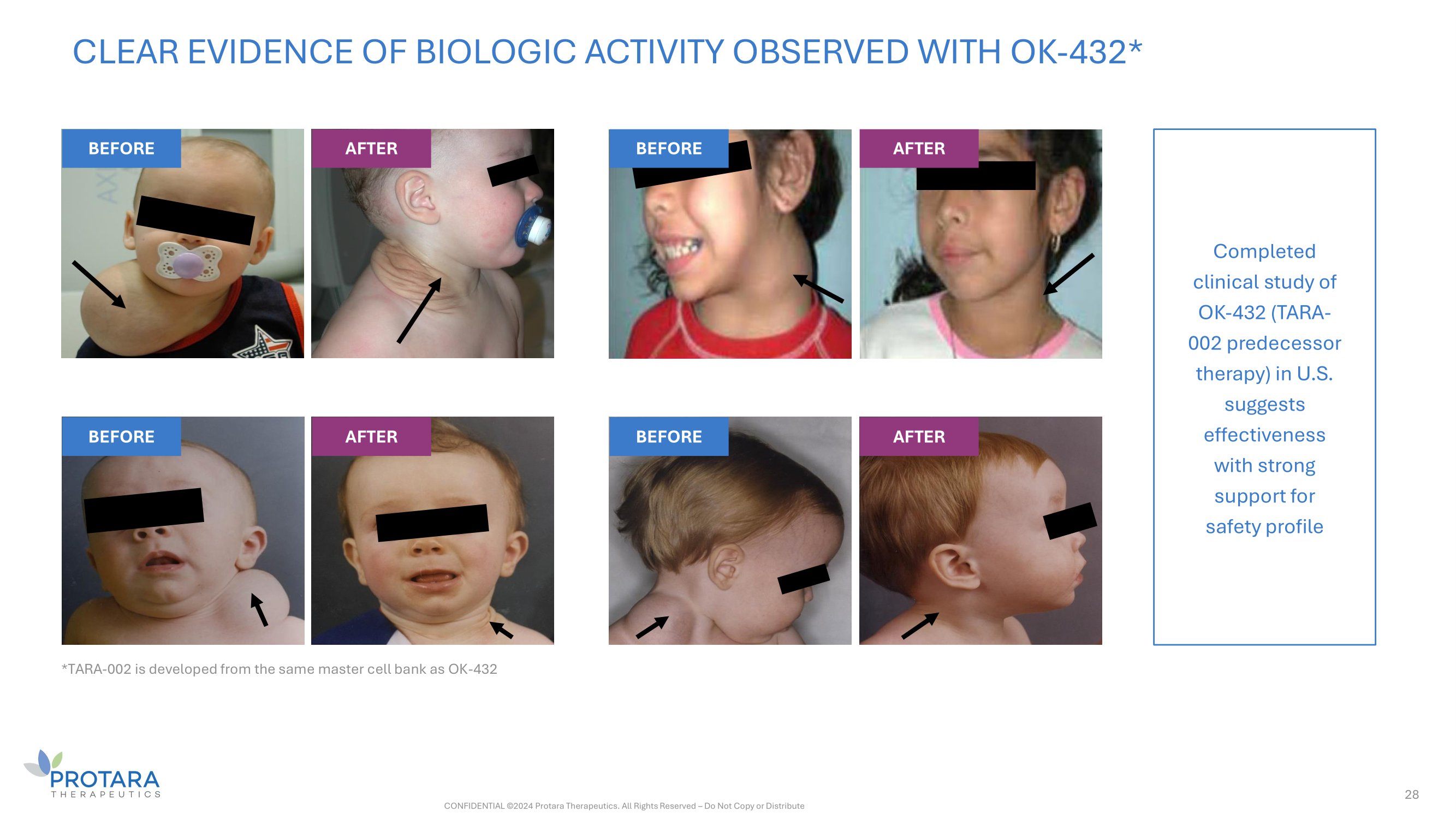 27 TARA - 002 IN LMs LYMPHATIC MALFORMATIONS Rare, non - malignant lesions consisting of dilated, lymphatic fluid - filled sacs caused by abnormal development of the lymphatic endothelial system (1) EPIDEMIOLOGY Epidemiology: incidence of lymphatic malformations is ≈1,400 - 1,800 LM cases per year (2) CURRENT TREATMENT OPTIONS Current treatment options include surgical excision with high complication (33%) and recurrence (55%) rates (3) as well as off - label use of sclerosants PRV UPON APPROVAL (POTENTIALLY $75MM - $100MM NON - DILUTIVE CAPITAL) Granted RPDD in 2021 NEXT STEPS Complete enrollment of first safety cohort and commence efficacy expansion cohort in Ph 2 STARBORN - 1 trial by end - 2024 1. Brouillard P, et al. J Clin Invest. 2014;124:898 - 904. | 2. Internal company estimates | 3. Ha J, et al. Curr Ped Rev. 2014;10:238 - 248. CONFIDENTIAL ©2024 Protara Therapeutics. All Rights Reserved – Do Not Copy or Distribute