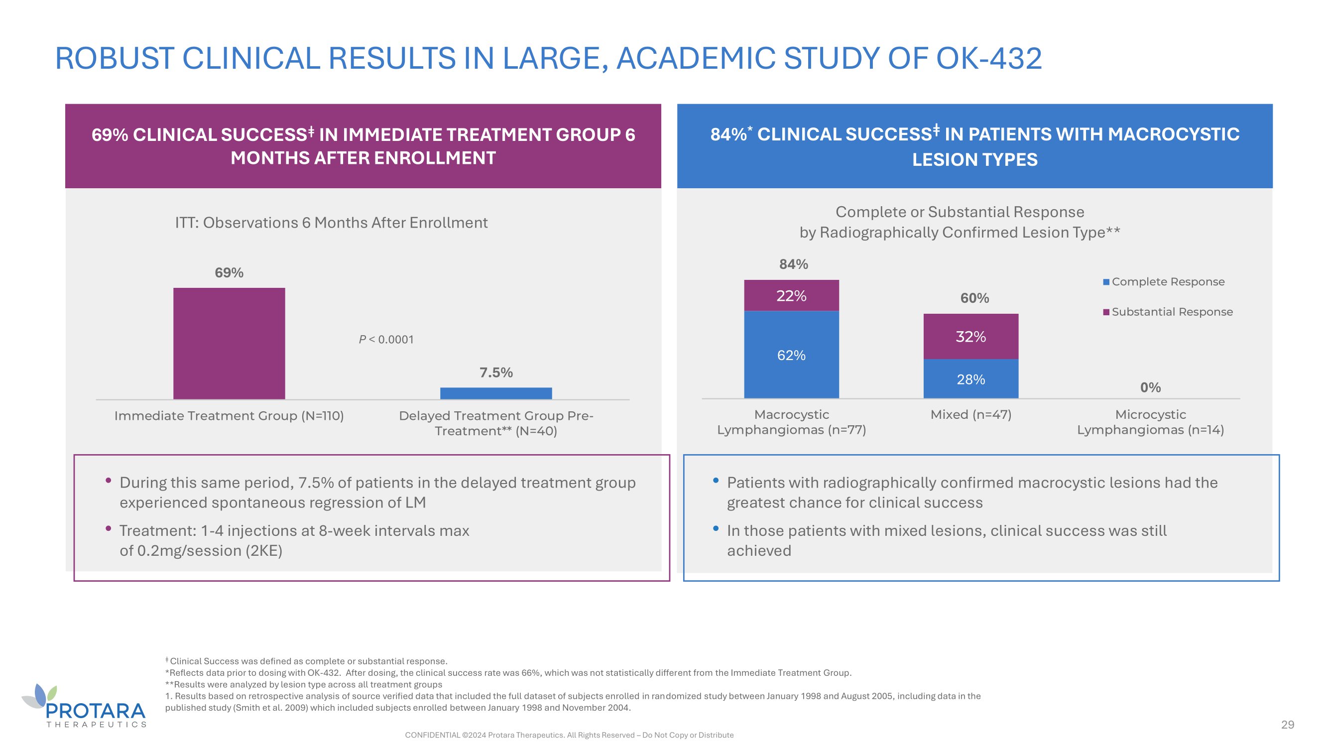 ROBUST CLINICAL RESULTS IN LARGE, ACADEMIC STUDY OF OK - 432 29 69% CLINICAL SUCCESS ǂ IN IMMEDIATE TREATMENT GROUP 6 MONTHS AFTER ENROLLMENT 84% * CLINICAL SUCCESS ǂ IN PATIENTS WITH MACROCYSTIC LESION TYPES 69% 7.5% Immediate Treatment Group (N=110) Delayed Treatment Group Pre - Treatment** (N=40) ITT: Observations 6 Months After Enrollment 62% 28% 0% 22% 32% Macrocystic Lymphangiomas (n=77) Mixed (n=47) Microcystic Lymphangiomas (n=14) Complete or Substantial Response by Radiographically Confirmed Lesion Type** Complete Response Substantial Response • Patients with radiographically confirmed macrocystic lesions had the greatest chance for clinical success • In those patients with mixed lesions, clinical success was still achieved • During this same period, 7.5% of patients in the delayed treatment group experienced spontaneous regression of LM • Treatment: 1 - 4 injections at 8 - week intervals max of 0.2mg/session (2KE) P < 0.0001 84% 60% ǂ Clinical Success was defined as complete or substantial response. *Reflects data prior to dosing with OK - 432. After dosing, the clinical success rate was 66%, which was not statistically different from the Immediate Treatment Group. **Results were analyzed by lesion type across all treatment groups 1. Results based on retrospective analysis of source verified data that included the full dataset of subjects enrolled in randomized study between January 1998 and August 2005, including data in the published study (Smith et al. 2009) which included subjects enrolled between January 1998 and November 2004. CONFIDENTIAL ©2024 Protara Therapeutics. All Rights Reserved – Do Not Copy or Distribute